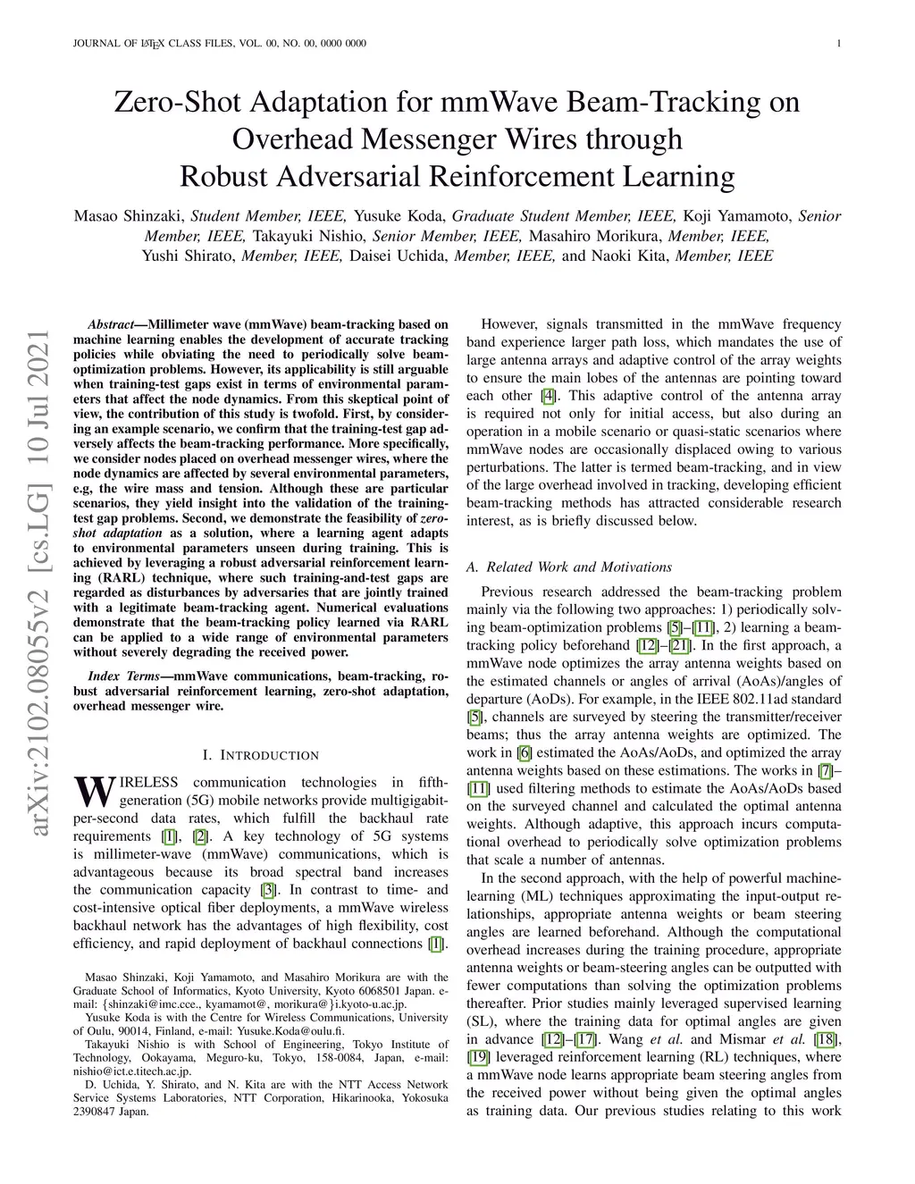 Millimeter wave (mmWave) beam-tracking based on machine learning enables the development of accurate tracking policies while obviating the need to periodically solve beam-optimization problems. However, its applicability is still arguable when training-test gaps exist in terms of environmental parameters that affect the node dynamics. From this skeptical point of view, the contribution of this study is twofold. First, by considering an example scenario, we confirm that the training-test gap adversely affects the beam-tracking performance. More specifically, we consider nodes placed on overhead messenger wires, where the node dynamics are affected by several environmental parameters, e.g, the wire mass and tension. Although these are particular scenarios, they yield insight into the validation of the training-test gap problems. Second, we demonstrate the feasibility of \textit{zero-shot adaptation} as a solution, where a learning agent adapts to environmental parameters unseen during training. This is achieved by leveraging a robust adversarial reinforcement learning (RARL) technique, where such training-and-test gaps are regarded as disturbances by adversaries that are jointly trained with a legitimate beam-tracking agent. Numerical evaluations demonstrate that the beam-tracking policy learned via RARL can be applied to a wide range of environmental parameters without severely degrading the received power.