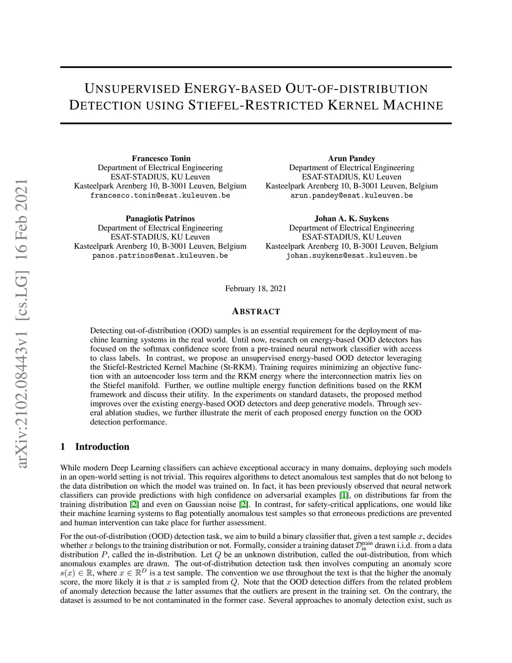 Detecting out-of-distribution (OOD) samples is an essential requirement for the deployment of machine learning systems in the real world. Until now, research on energy-based OOD detectors has focused on the softmax confidence score from a pre-trained neural network classifier with access to class labels. In contrast, we propose an unsupervised energy-based OOD detector leveraging the Stiefel-Restricted Kernel Machine (St-RKM). Training requires minimizing an objective function with an autoencoder loss term and the RKM energy where the interconnection matrix lies on the Stiefel manifold. Further, we outline multiple energy function definitions based on the RKM framework and discuss their utility. In the experiments on standard datasets, the proposed method improves over the existing energy-based OOD detectors and deep generative models. Through several ablation studies, we further illustrate the merit of each proposed energy function on the OOD detection performance.