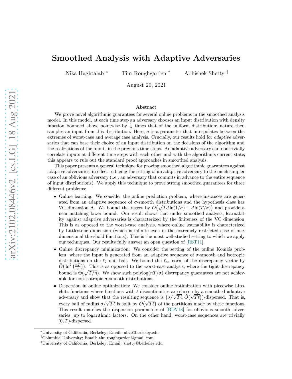 We prove novel algorithmic guarantees for several online problems in the smoothed analysis model. In this model, at each time an adversary chooses an input distribution with density function bounded above by times that of the uniform distribution; nature then samples an input from this distribution. Crucially, our results hold for {\em adaptive} adversaries that can choose an input distribution based on the decisions of the algorithm and the realizations of the inputs in the previous time steps. This paper presents a general technique for proving smoothed algorithmic guarantees against adaptive adversaries, in effect reducing the setting of adaptive adversaries to the simpler case of oblivious adversaries. We apply this technique to prove strong smoothed guarantees for three problems: -Online learning: We consider the online prediction problem, where instances are generated from an adaptive sequence of -smooth distributions and the hypothesis class has VC dimension . We bound the regret by . This answers open questions of [RST11,Hag18]. -Online discrepancy minimization: We consider the online Koml\ós problem, where the input is generated from an adaptive sequence of -smooth and isotropic distributions on the unit ball. We bound the norm of the discrepancy vector by . -Dispersion in online optimization: We consider online optimization of piecewise Lipschitz functions where functions with discontinuities are chosen by a smoothed adaptive adversary and show that the resulting sequence is -dispersed. This matches the parameters of [BDV18] for oblivious adversaries, up to log factors.