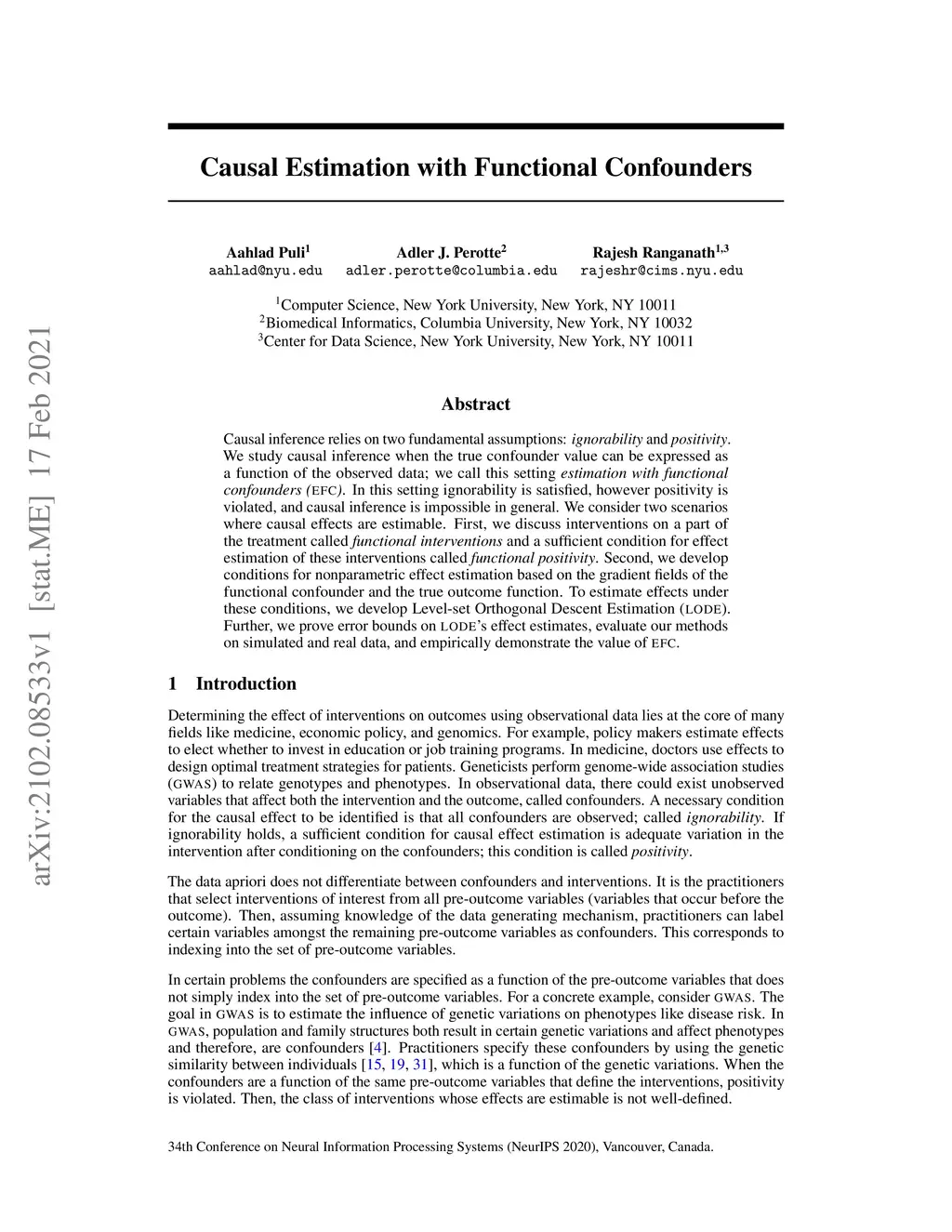 Causal inference relies on two fundamental assumptions: ignorability and positivity. We study causal inference when the true confounder value can be expressed as a function of the observed data; we call this setting estimation with functional confounders (EFC). In this setting, ignorability is satisfied, however positivity is violated, and causal inference is impossible in general. We consider two scenarios where causal effects are estimable. First, we discuss interventions on a part of the treatment called functional interventions and a sufficient condition for effect estimation of these interventions called functional positivity. Second, we develop conditions for nonparametric effect estimation based on the gradient fields of the functional confounder and the true outcome function. To estimate effects under these conditions, we develop Level-set Orthogonal Descent Estimation (LODE). Further, we prove error bounds on LODE's effect estimates, evaluate our methods on simulated and real data, and empirically demonstrate the value of EFC.