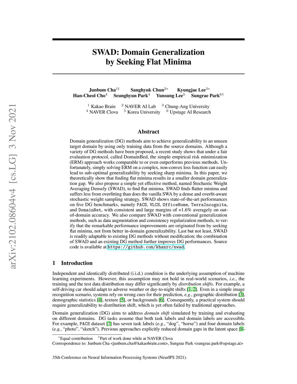 SWAD: Domain Generalization by Seeking Flat Minima