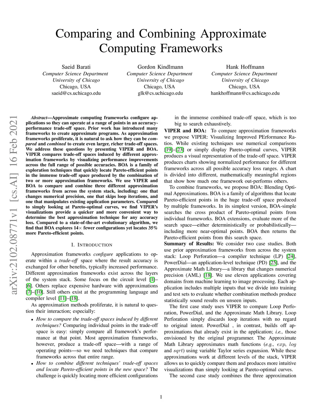 Approximate computing frameworks configure applications so they can operate at a range of points in an accuracy-performance trade-off space. Prior work has introduced many frameworks to create approximate programs. As approximation frameworks proliferate, it is natural to ask how they can be compared and combined to create even larger, richer trade-off spaces. We address these questions by presenting VIPER and BOA. VIPER compares trade-off spaces induced by different approximation frameworks by visualizing performance improvements across the full range of possible accuracies. BOA is a family of exploration techniques that quickly locate Pareto-efficient points in the immense trade-off space produced by the combination of two or more approximation frameworks. We use VIPER and BOA to compare and combine three different approximation frameworks from across the system stack, including: one that changes numerical precision, one that skips loop iterations, and one that manipulates existing application parameters. Compared to simply looking at Pareto-optimal curves, we find VIPER's visualizations provide a quicker and more convenient way to determine the best approximation technique for any accuracy loss. Compared to a state-of-the-art evolutionary algorithm, we find that BOA explores 14x fewer configurations yet locates 35% more Pareto-efficient points.