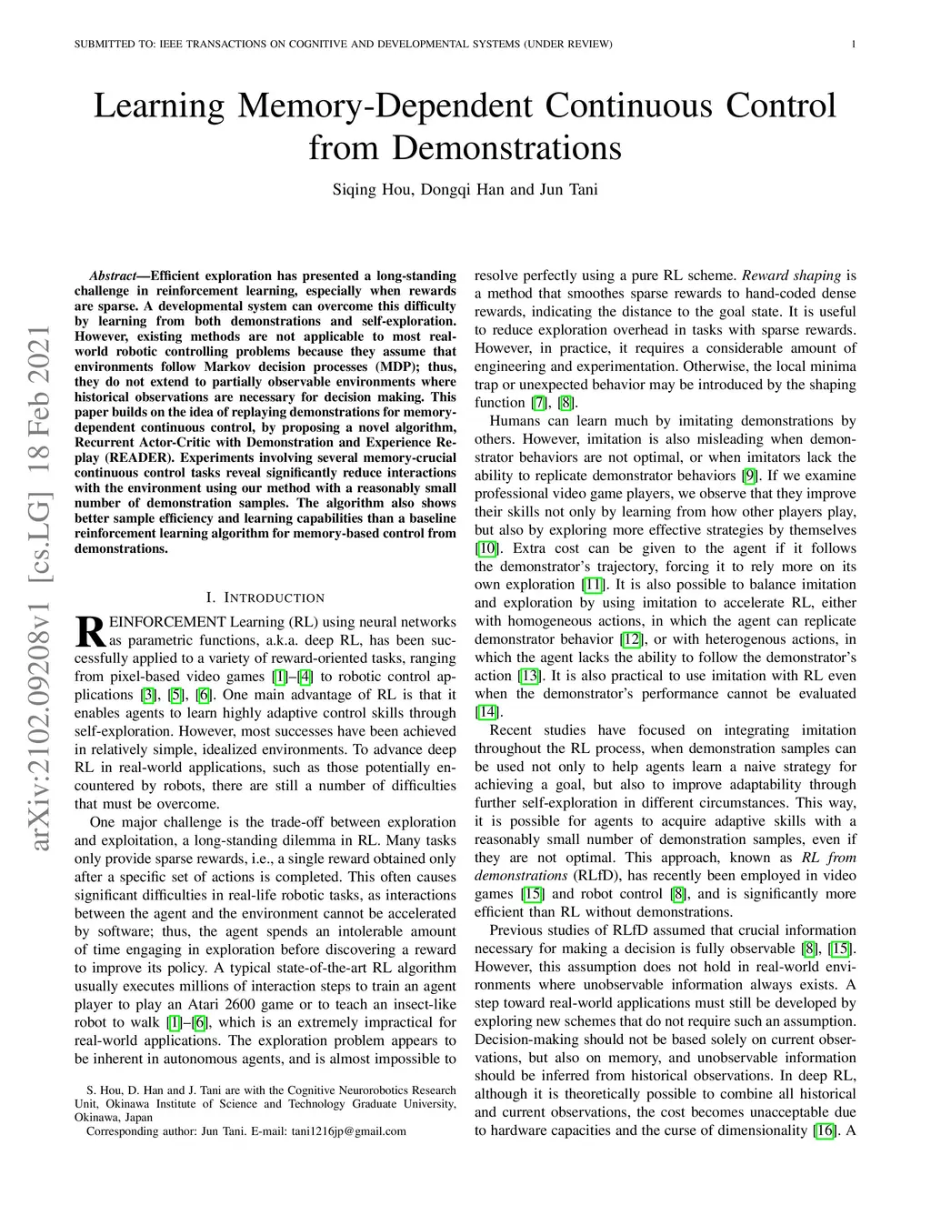 Efficient exploration has presented a long-standing challenge in reinforcement learning, especially when rewards are sparse. A developmental system can overcome this difficulty by learning from both demonstrations and self-exploration. However, existing methods are not applicable to most real-world robotic controlling problems because they assume that environments follow Markov decision processes (MDP); thus, they do not extend to partially observable environments where historical observations are necessary for decision making. This paper builds on the idea of replaying demonstrations for memory-dependent continuous control, by proposing a novel algorithm, Recurrent Actor-Critic with Demonstration and Experience Replay (READER). Experiments involving several memory-crucial continuous control tasks reveal significantly reduce interactions with the environment using our method with a reasonably small number of demonstration samples. The algorithm also shows better sample efficiency and learning capabilities than a baseline reinforcement learning algorithm for memory-based control from demonstrations.