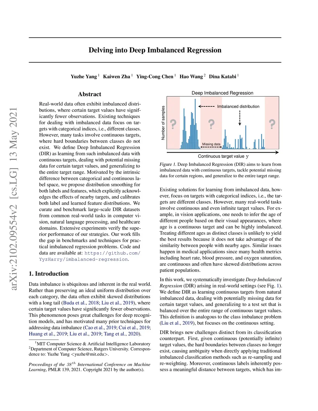 Real-world data often exhibit imbalanced distributions, where certain target values have significantly fewer observations. Existing techniques for dealing with imbalanced data focus on targets with categorical indices, i.e., different classes. However, many tasks involve continuous targets, where hard boundaries between classes do not exist. We define Deep Imbalanced Regression (DIR) as learning from such imbalanced data with continuous targets, dealing with potential missing data for certain target values, and generalizing to the entire target range. Motivated by the intrinsic difference between categorical and continuous label space, we propose distribution smoothing for both labels and features, which explicitly acknowledges the effects of nearby targets, and calibrates both label and learned feature distributions. We curate and benchmark large-scale DIR datasets from common real-world tasks in computer vision, natural language processing, and healthcare domains. Extensive experiments verify the superior performance of our strategies. Our work fills the gap in benchmarks and techniques for practical imbalanced regression problems. Code and data are available at https://github.com/YyzHarry/imbalanced-regression.
