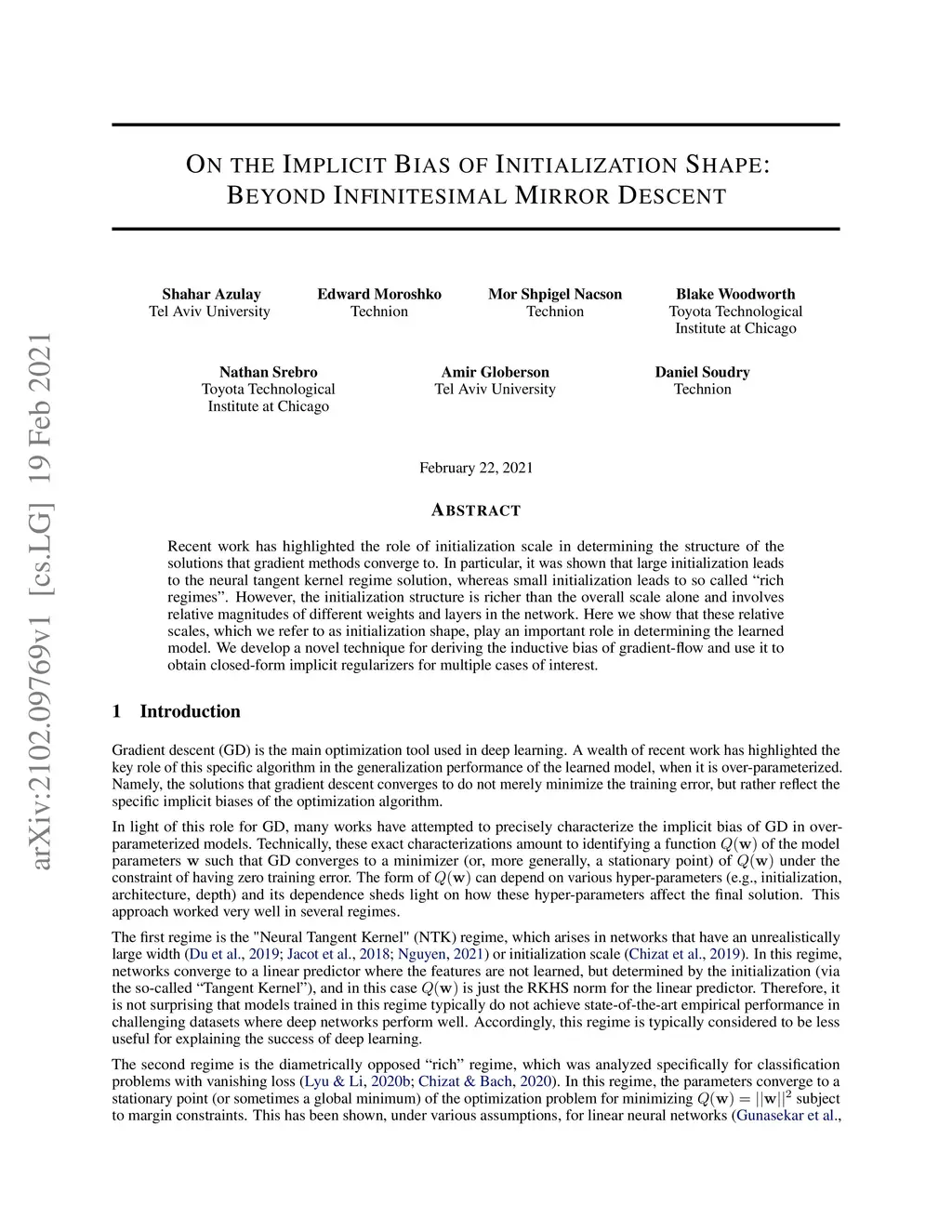 Recent work has highlighted the role of initialization scale in determining the structure of the solutions that gradient methods converge to. In particular, it was shown that large initialization leads to the neural tangent kernel regime solution, whereas small initialization leads to so called "rich regimes". However, the initialization structure is richer than the overall scale alone and involves relative magnitudes of different weights and layers in the network. Here we show that these relative scales, which we refer to as initialization shape, play an important role in determining the learned model. We develop a novel technique for deriving the inductive bias of gradient-flow and use it to obtain closed-form implicit regularizers for multiple cases of interest.