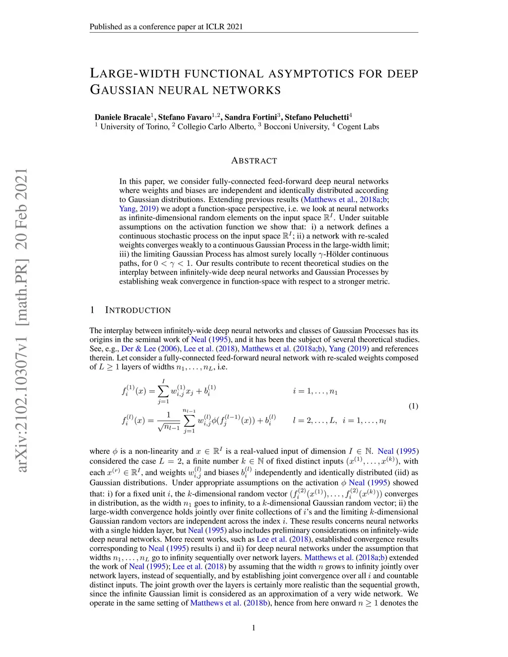 In this paper, we consider fully connected feed-forward deep neural networks where weights and biases are independent and identically distributed according to Gaussian distributions. Extending previous results (Matthews et al., 2018a;b; Yang, 2019) we adopt a function-space perspective, i.e. we look at neural networks as infinite-dimensional random elements on the input space . Under suitable assumptions on the activation function we show that: i) a network defines a continuous Gaussian process on the input space ; ii) a network with re-scaled weights converges weakly to a continuous Gaussian process in the large-width limit; iii) the limiting Gaussian process has almost surely locally -H\"older continuous paths, for . Our results contribute to recent theoretical studies on the interplay between infinitely wide deep neural networks and Gaussian processes by establishing weak convergence in function-space with respect to a stronger metric.