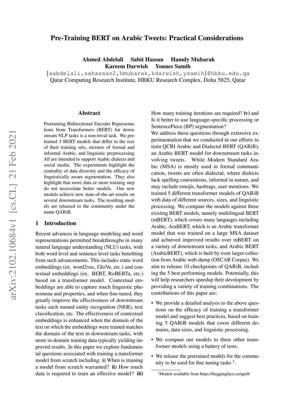 Pretraining Bidirectional Encoder Representations from Transformers (BERT) for downstream NLP tasks is a non-trival task. We pretrained 5 BERT models that differ in the size of their training sets, mixture of formal and informal Arabic, and linguistic preprocessing. All are intended to support Arabic dialects and social media. The experiments highlight the centrality of data diversity and the efficacy of linguistically aware segmentation. They also highlight that more data or more training step do not necessitate better models. Our new models achieve new state-of-the-art results on several downstream tasks. The resulting models are released to the community under the name QARiB.