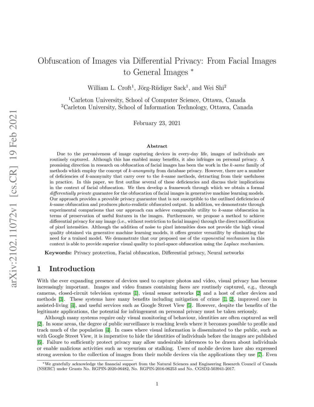 Due to the pervasiveness of image capturing devices in every-day life, images of individuals are routinely captured. Although this has enabled many benefits, it also infringes on personal privacy. A promising direction in research on obfuscation of facial images has been the work in the k-same family of methods which employ the concept of k-anonymity from database privacy. However, there are a number of deficiencies of k-anonymity that carry over to the k-same methods, detracting from their usefulness in practice. In this paper, we first outline several of these deficiencies and discuss their implications in the context of facial obfuscation. We then develop a framework through which we obtain a formal differentially private guarantee for the obfuscation of facial images in generative machine learning models. Our approach provides a provable privacy guarantee that is not susceptible to the outlined deficiencies of k-same obfuscation and produces photo-realistic obfuscated output. In addition, we demonstrate through experimental comparisons that our approach can achieve comparable utility to k-same obfuscation in terms of preservation of useful features in the images. Furthermore, we propose a method to achieve differential privacy for any image (i.e., without restriction to facial images) through the direct modification of pixel intensities. Although the addition of noise to pixel intensities does not provide the high visual quality obtained via generative machine learning models, it offers greater versatility by eliminating the need for a trained model. We demonstrate that our proposed use of the exponential mechanism in this context is able to provide superior visual quality to pixel-space obfuscation using the Laplace mechanism.