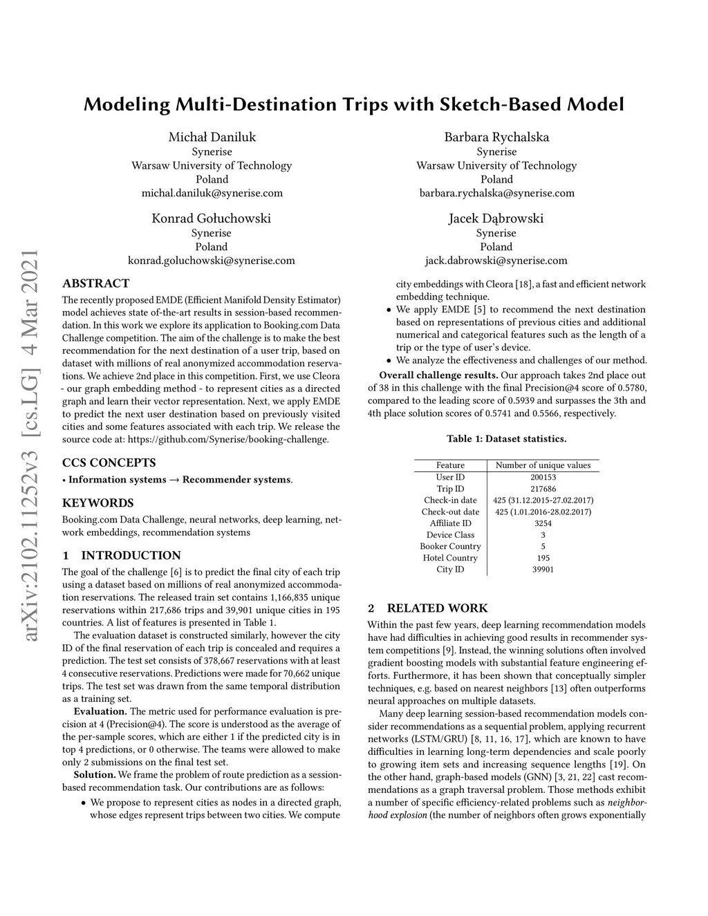 The recently proposed EMDE (Efficient Manifold Density Estimator) model achieves state of-the-art results in session-based recommendation. In this work we explore its application to Booking Data Challenge competition. The aim of the challenge is to make the best recommendation for the next destination of a user trip, based on dataset with millions of real anonymized accommodation reservations. We achieve 2nd place in this competition. First, we use Cleora - our graph embedding method - to represent cities as a directed graph and learn their vector representation. Next, we apply EMDE to predict the next user destination based on previously visited cities and some features associated with each trip. We release the source code at: https://github.com/Synerise/booking-challenge.