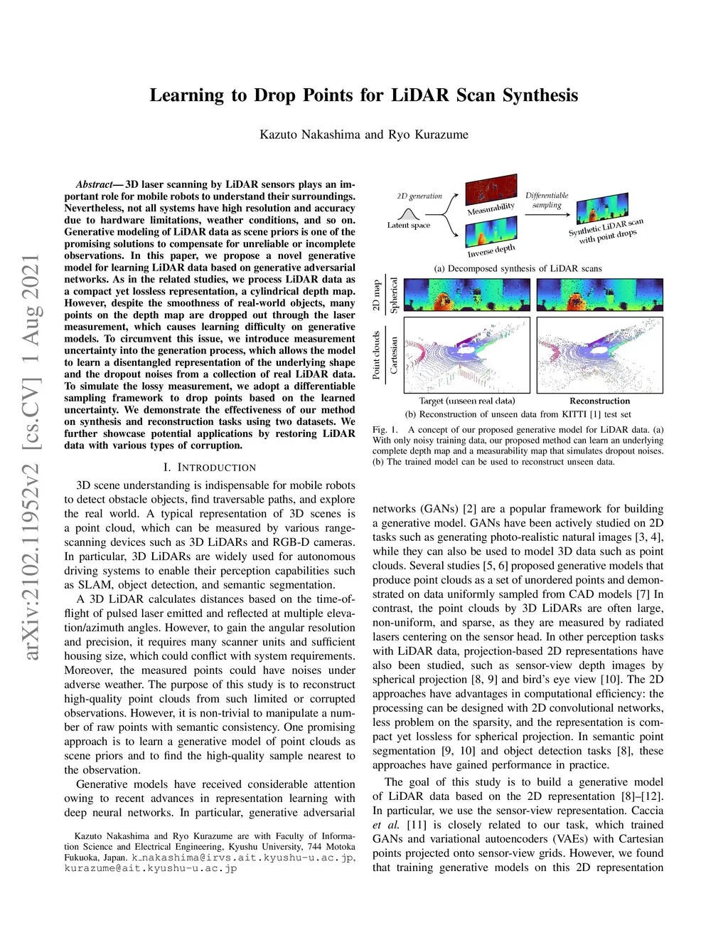 3D laser scanning by LiDAR sensors plays an important role for mobile robots to understand their surroundings. Nevertheless, not all systems have high resolution and accuracy due to hardware limitations, weather conditions, and so on. Generative modeling of LiDAR data as scene priors is one of the promising solutions to compensate for unreliable or incomplete observations. In this paper, we propose a novel generative model for learning LiDAR data based on generative adversarial networks. As in the related studies, we process LiDAR data as a compact yet lossless representation, a cylindrical depth map. However, despite the smoothness of real-world objects, many points on the depth map are dropped out through the laser measurement, which causes learning difficulty on generative models. To circumvent this issue, we introduce measurement uncertainty into the generation process, which allows the model to learn a disentangled representation of the underlying shape and the dropout noises from a collection of real LiDAR data. To simulate the lossy measurement, we adopt a differentiable sampling framework to drop points based on the learned uncertainty. We demonstrate the effectiveness of our method on synthesis and reconstruction tasks using two datasets. We further showcase potential applications by restoring LiDAR data with various types of corruption.
