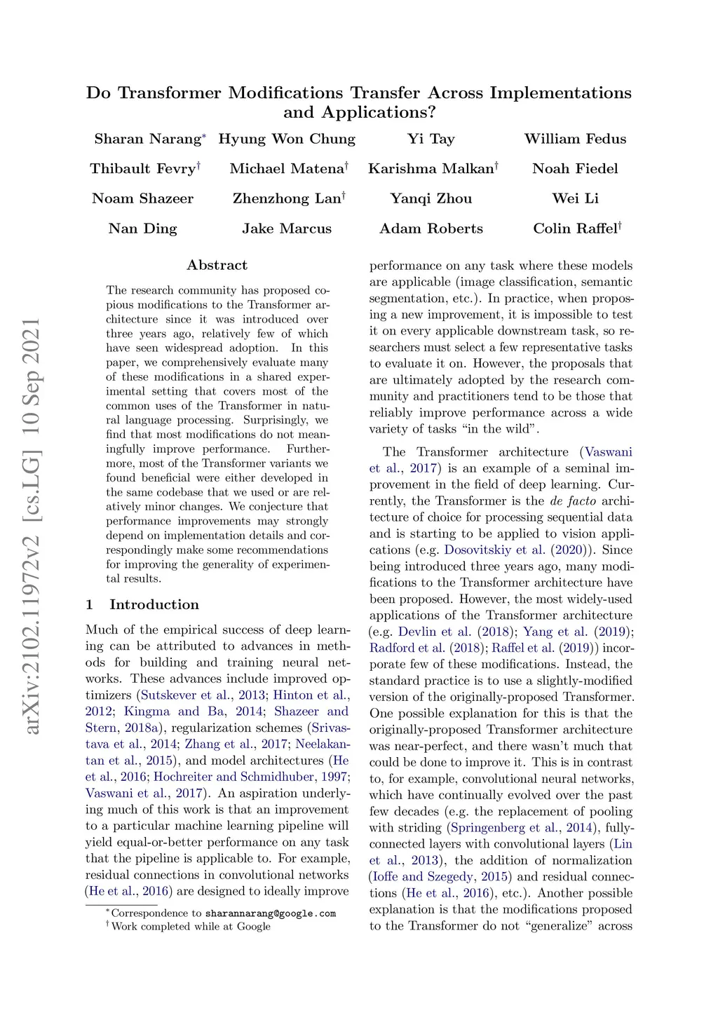 The research community has proposed copious modifications to the Transformer architecture since it was introduced over three years ago, relatively few of which have seen widespread adoption. In this paper, we comprehensively evaluate many of these modifications in a shared experimental setting that covers most of the common uses of the Transformer in natural language processing. Surprisingly, we find that most modifications do not meaningfully improve performance. Furthermore, most of the Transformer variants we found beneficial were either developed in the same codebase that we used or are relatively minor changes. We conjecture that performance improvements may strongly depend on implementation details and correspondingly make some recommendations for improving the generality of experimental results.