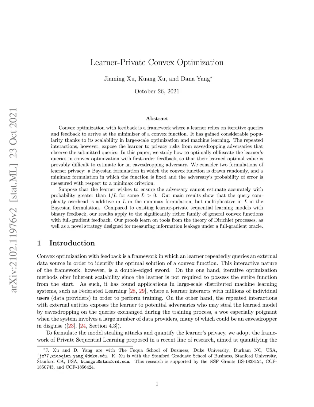 Convex optimization with feedback is a framework where a learner relies on iterative queries and feedback to arrive at the minimizer of a convex function. It has gained considerable popularity thanks to its scalability in large-scale optimization and machine learning. The repeated interactions, however, expose the learner to privacy risks from eavesdropping adversaries that observe the submitted queries. In this paper, we study how to optimally obfuscate the learner's queries in convex optimization with first-order feedback, so that their learned optimal value is provably difficult to estimate for an eavesdropping adversary. We consider two formulations of learner privacy: a Bayesian formulation in which the convex function is drawn randomly, and a minimax formulation in which the function is fixed and the adversary's probability of error is measured with respect to a minimax criterion. Suppose that the learner wishes to ensure the adversary cannot estimate accurately with probability greater than for some . Our main results show that the query complexity overhead is additive in in the minimax formulation, but multiplicative in in the Bayesian formulation. Compared to existing learner-private sequential learning models with binary feedback, our results apply to the significantly richer family of general convex functions with full-gradient feedback. Our proofs learn on tools from the theory of Dirichlet processes, as well as a novel strategy designed for measuring information leakage under a full-gradient oracle.