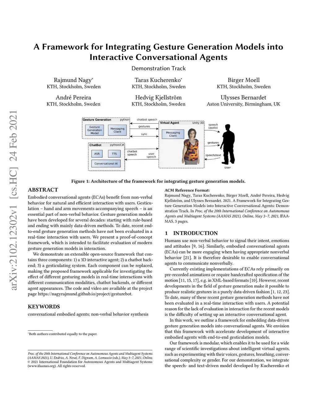 Embodied conversational agents (ECAs) benefit from non-verbal behavior for natural and efficient interaction with users. Gesticulation - hand and arm movements accompanying speech - is an essential part of non-verbal behavior. Gesture generation models have been developed for several decades: starting with rule-based and ending with mainly data-driven methods. To date, recent end-to-end gesture generation methods have not been evaluated in a real-time interaction with users. We present a proof-of-concept framework, which is intended to facilitate evaluation of modern gesture generation models in interaction. We demonstrate an extensible open-source framework that contains three components: 1) a 3D interactive agent; 2) a chatbot backend; 3) a gesticulating system. Each component can be replaced, making the proposed framework applicable for investigating the effect of different gesturing models in real-time interactions with different communication modalities, chatbot backends, or different agent appearances. The code and video are available at the project page https://nagyrajmund.github.io/project/gesturebot.