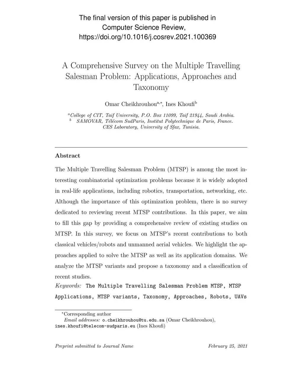 The Multiple Travelling Salesman Problem (MTSP) is among the most interesting combinatorial optimization problems because it is widely adopted in real-life applications, including robotics, transportation, networking, etc. Although the importance of this optimization problem, there is no survey dedicated to reviewing recent MTSP contributions. In this paper, we aim to fill this gap by providing a comprehensive review of existing studies on MTSP. In this survey, we focus on MTSP's recent contributions to both classical vehicles/robots and unmanned aerial vehicles. We highlight the approaches applied to solve the MTSP as well as its application domains. We analyze the MTSP variants and propose a taxonomy and a classification of recent studies.