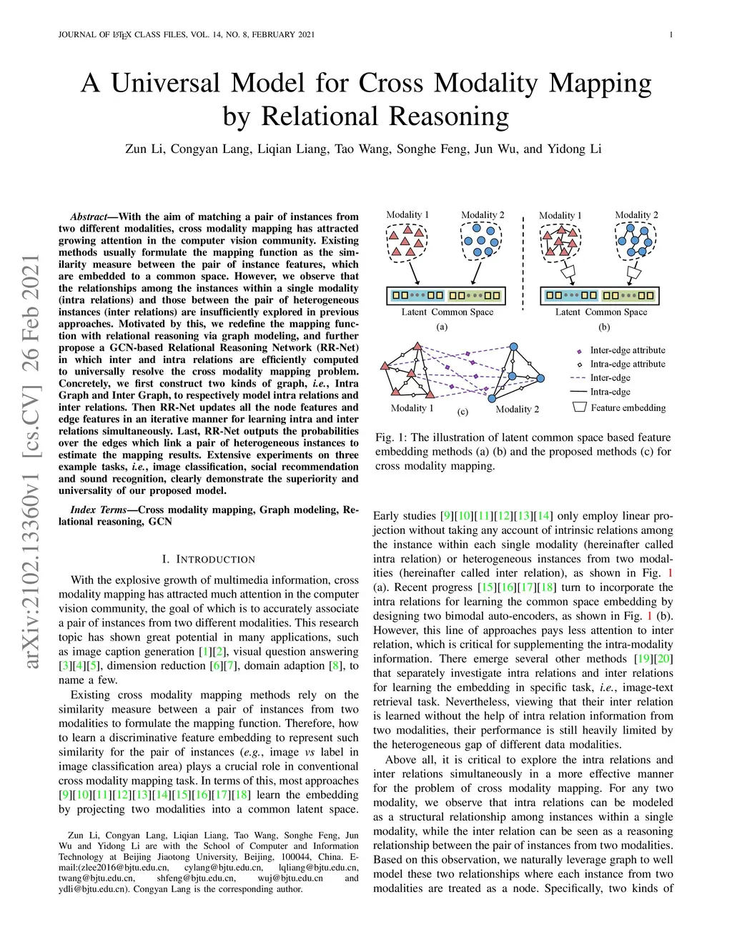 With the aim of matching a pair of instances from two different modalities, cross modality mapping has attracted growing attention in the computer vision community. Existing methods usually formulate the mapping function as the similarity measure between the pair of instance features, which are embedded to a common space. However, we observe that the relationships among the instances within a single modality (intra relations) and those between the pair of heterogeneous instances (inter relations) are insufficiently explored in previous approaches. Motivated by this, we redefine the mapping function with relational reasoning via graph modeling, and further propose a GCN-based Relational Reasoning Network (RR-Net) in which inter and intra relations are efficiently computed to universally resolve the cross modality mapping problem. Concretely, we first construct two kinds of graph, i.e., Intra Graph and Inter Graph, to respectively model intra relations and inter relations. Then RR-Net updates all the node features and edge features in an iterative manner for learning intra and inter relations simultaneously. Last, RR-Net outputs the probabilities over the edges which link a pair of heterogeneous instances to estimate the mapping results. Extensive experiments on three example tasks, i.e., image classification, social recommendation and sound recognition, clearly demonstrate the superiority and universality of our proposed model.