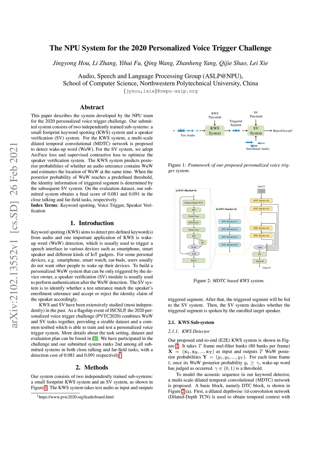 This paper describes the system developed by the NPU team for the 2020 personalized voice trigger challenge. Our submitted system consists of two independently trained subsystems: a small footprint keyword spotting (KWS) system and a speaker verification (SV) system. For the KWS system, a multi-scale dilated temporal convolutional (MDTC) network is proposed to detect wake-up word (WuW). For SV system, Write something here. The KWS predicts posterior probabilities of whether an audio utterance contains WuW and estimates the location of WuW at the same time. When the posterior probability ofWuW reaches a predefined threshold, the identity information of triggered segment is determined by the SV system. On evaluation dataset, our submitted system obtains detection costs of 0.081and 0.091 in close talking and far-field tasks, respectively.