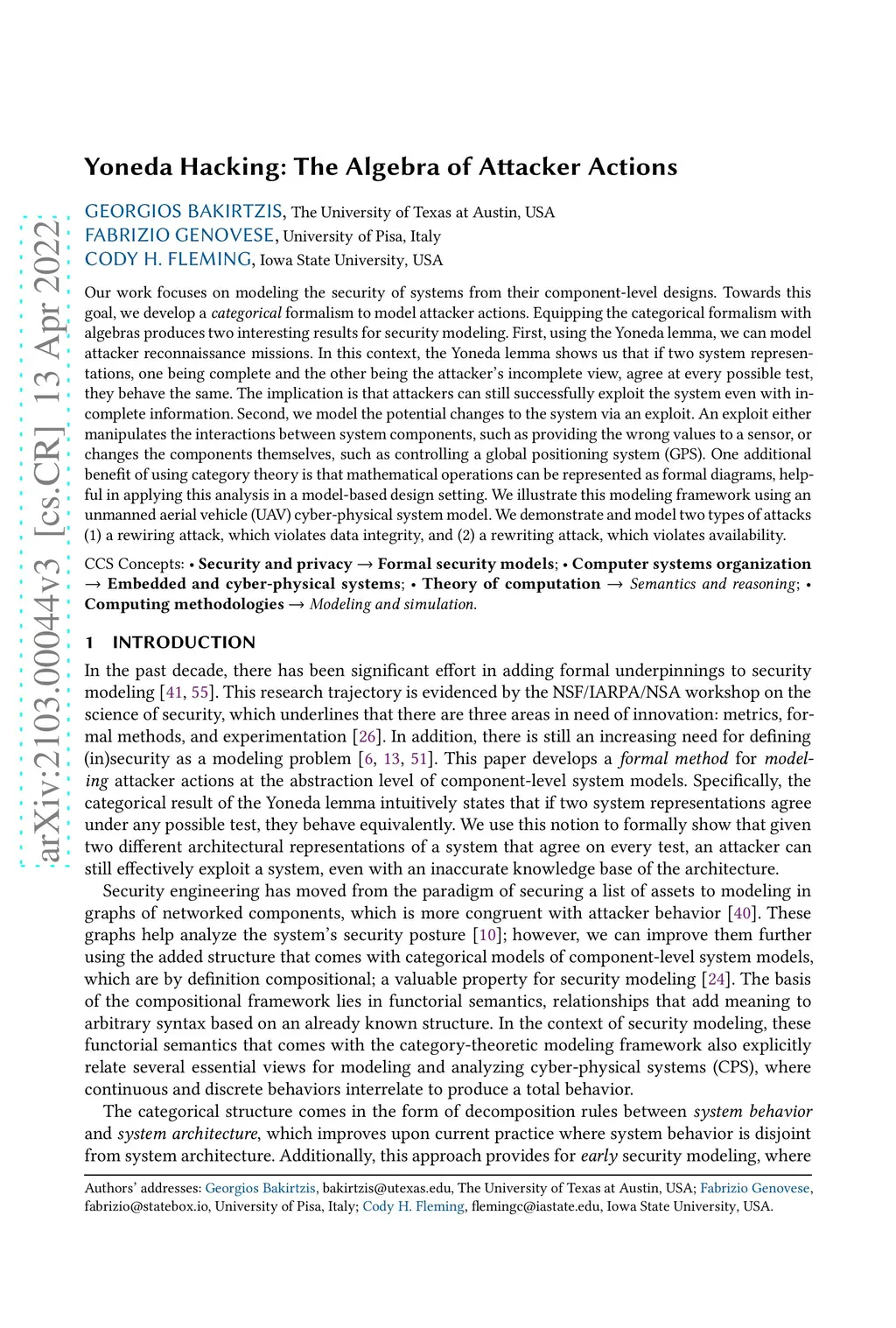 Our work focuses on modeling the security of systems from their component-level designs. Towards this goal, we develop a categorical formalism to model attacker actions. Equipping the categorical formalism with algebras produces two interesting results for security modeling. First, using the Yoneda lemma, we can model attacker reconnaissance missions. In this context, the Yoneda lemma shows us that if two system representations, one being complete and the other being the attacker's incomplete view, agree at every possible test, they behave the same. The implication is that attackers can still successfully exploit the system even with incomplete information. Second, we model the potential changes to the system via an exploit. An exploit either manipulates the interactions between system components, such as providing the wrong values to a sensor, or changes the components themselves, such as controlling a global positioning system (GPS). One additional benefit of using category theory is that mathematical operations can be represented as formal diagrams, helpful in applying this analysis in a model-based design setting. We illustrate this modeling framework using an unmanned aerial vehicle (UAV) cyber-physical system model. We demonstrate and model two types of attacks (1) a rewiring attack, which violates data integrity, and (2) a rewriting attack, which violates availability.