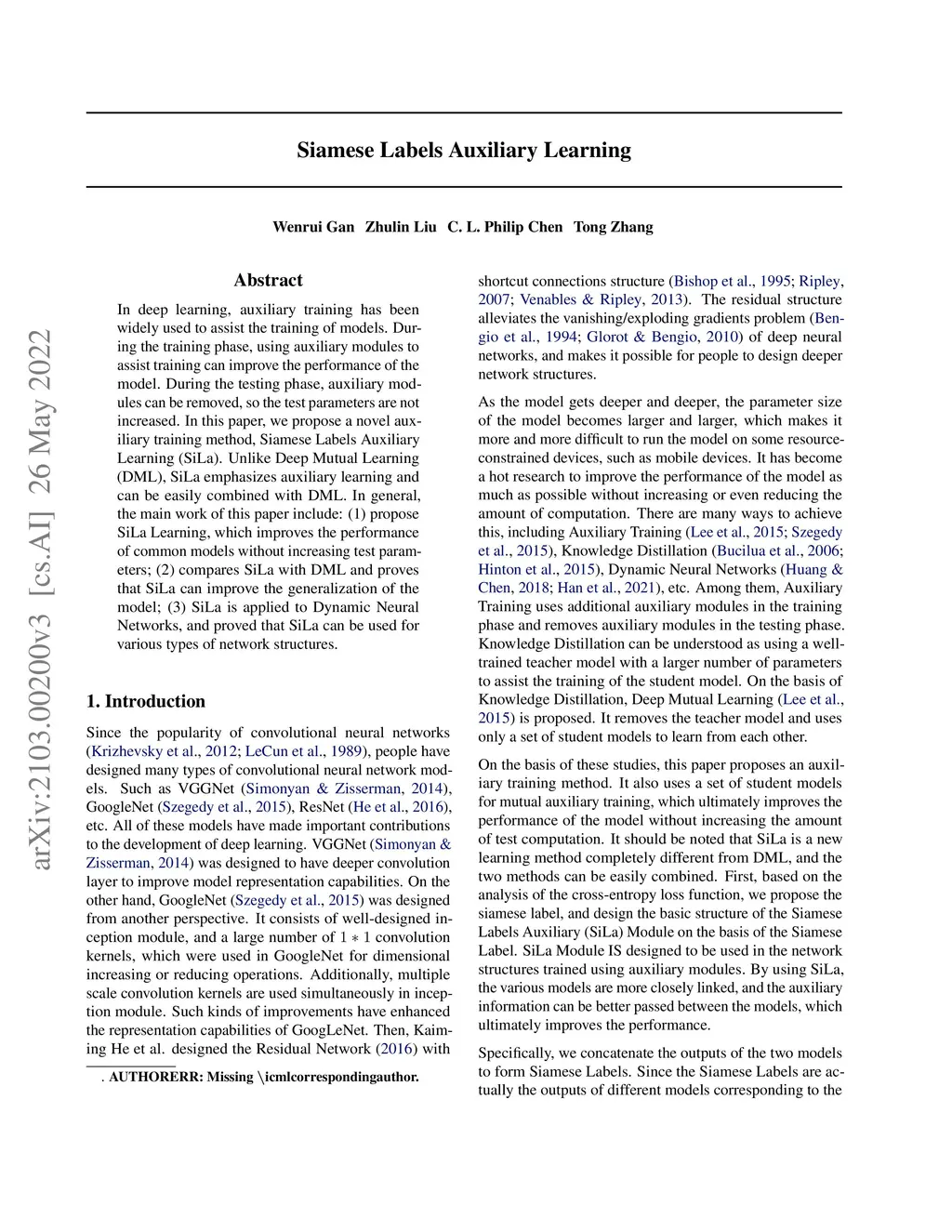 In deep learning, auxiliary training has been widely used to assist the training of models. During the training phase, using auxiliary modules to assist training can improve the performance of the model. During the testing phase, auxiliary modules can be removed, so the test parameters are not increased. In this paper, we propose a novel auxiliary training method, Siamese Labels Auxiliary Learning (SiLa). Unlike Deep Mutual Learning (DML), SiLa emphasizes auxiliary learning and can be easily combined with DML. In general, the main work of this paper include: (1) propose SiLa Learning, which improves the performance of common models without increasing test parameters; (2) compares SiLa with DML and proves that SiLa can improve the generalization of the model; (3) SiLa is applied to Dynamic Neural Networks, and proved that SiLa can be used for various types of network structures.