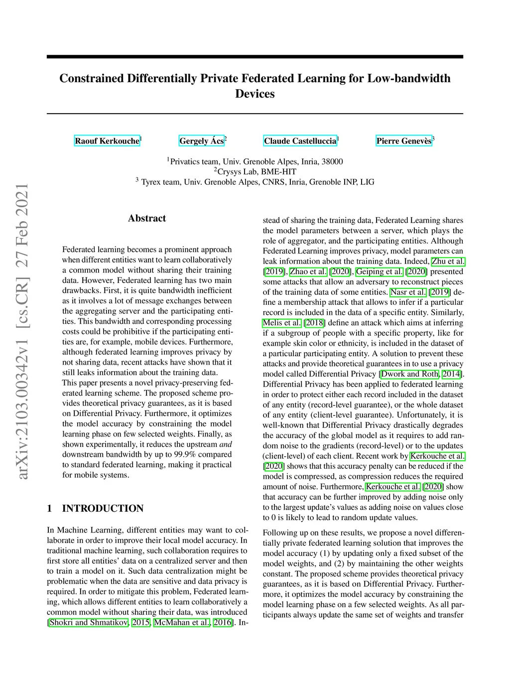 Federated learning becomes a prominent approach when different entities want to learn collaboratively a common model without sharing their training data. However, Federated learning has two main drawbacks. First, it is quite bandwidth inefficient as it involves a lot of message exchanges between the aggregating server and the participating entities. This bandwidth and corresponding processing costs could be prohibitive if the participating entities are, for example, mobile devices. Furthermore, although federated learning improves privacy by not sharing data, recent attacks have shown that it still leaks information about the training data. This paper presents a novel privacy-preserving federated learning scheme. The proposed scheme provides theoretical privacy guarantees, as it is based on Differential Privacy. Furthermore, it optimizes the model accuracy by constraining the model learning phase on few selected weights. Finally, as shown experimentally, it reduces the upstream and downstream bandwidth by up to 99.9% compared to standard federated learning, making it practical for mobile systems.