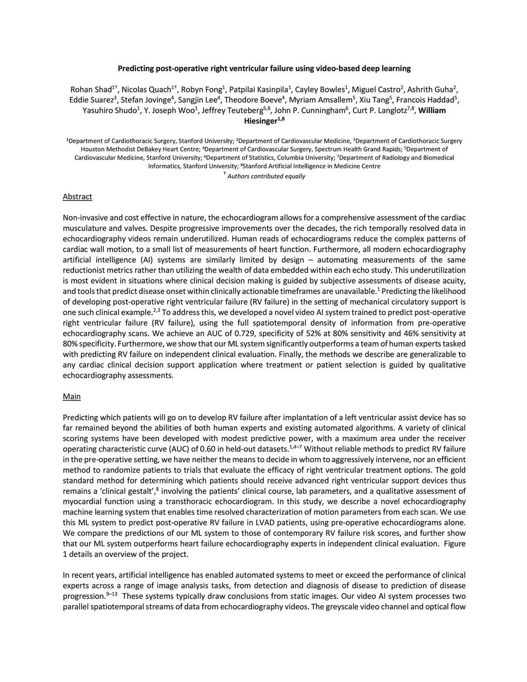 Non-invasive and cost effective in nature, the echocardiogram allows for a comprehensive assessment of the cardiac musculature and valves. Despite progressive improvements over the decades, the rich temporally resolved data in echocardiography videos remain underutilized. Human reads of echocardiograms reduce the complex patterns of cardiac wall motion, to a small list of measurements of heart function. Furthermore, all modern echocardiography artificial intelligence (AI) systems are similarly limited by design - automating measurements of the same reductionist metrics rather than utilizing the wealth of data embedded within each echo study. This underutilization is most evident in situations where clinical decision making is guided by subjective assessments of disease acuity, and tools that predict disease onset within clinically actionable timeframes are unavailable. Predicting the likelihood of developing post-operative right ventricular failure (RV failure) in the setting of mechanical circulatory support is one such clinical example. To address this, we developed a novel video AI system trained to predict post-operative right ventricular failure (RV failure), using the full spatiotemporal density of information from pre-operative echocardiography scans. We achieve an AUC of 0.729, specificity of 52% at 80% sensitivity and 46% sensitivity at 80% specificity. Furthermore, we show that our ML system significantly outperforms a team of human experts tasked with predicting RV failure on independent clinical evaluation. Finally, the methods we describe are generalizable to any cardiac clinical decision support application where treatment or patient selection is guided by qualitative echocardiography assessments.