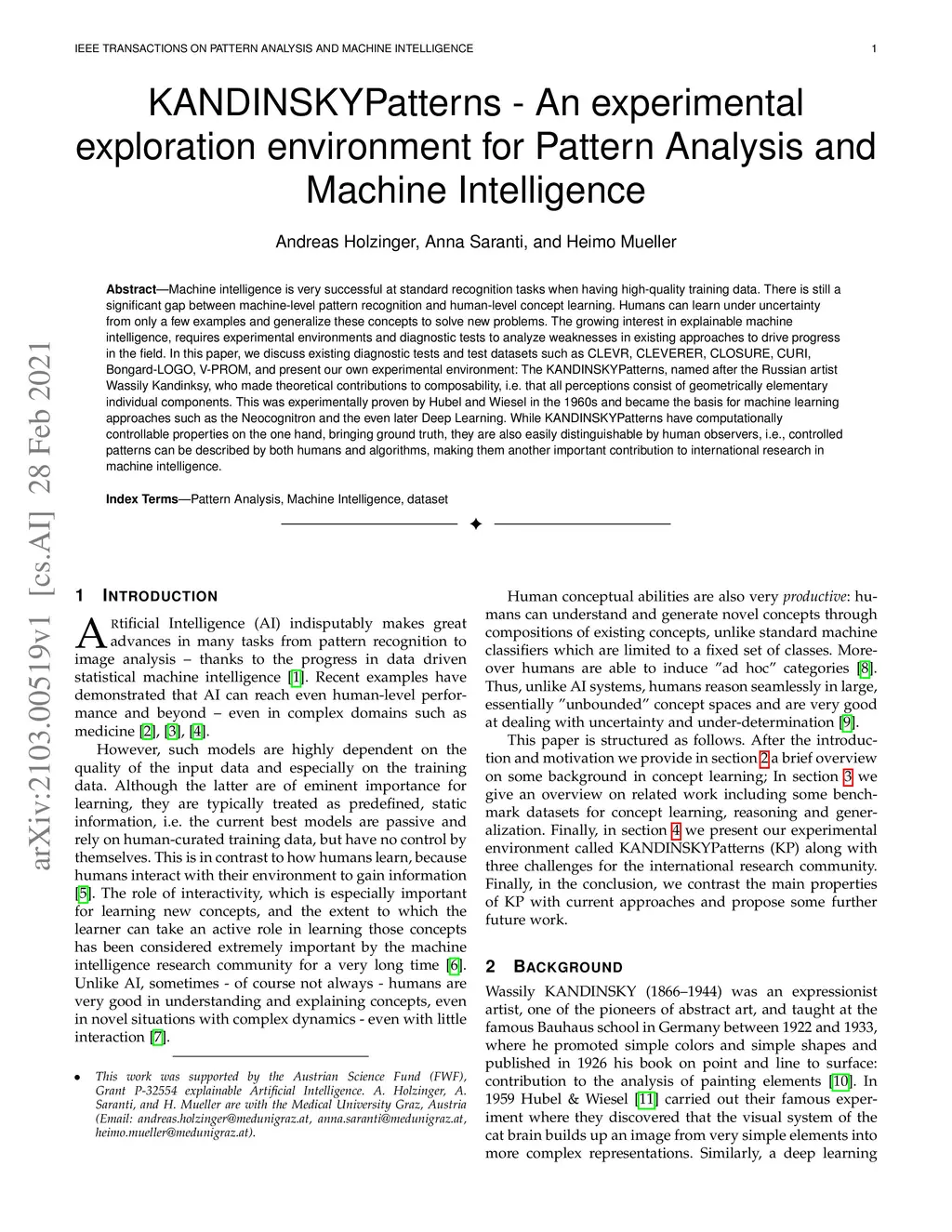 Machine intelligence is very successful at standard recognition tasks when having high-quality training data. There is still a significant gap between machine-level pattern recognition and human-level concept learning. Humans can learn under uncertainty from only a few examples and generalize these concepts to solve new problems. The growing interest in explainable machine intelligence, requires experimental environments and diagnostic tests to analyze weaknesses in existing approaches to drive progress in the field. In this paper, we discuss existing diagnostic tests and test data sets such as CLEVR, CLEVERER, CLOSURE, CURI, Bongard-LOGO, V-PROM, and present our own experimental environment: The KANDINSKYPatterns, named after the Russian artist Wassily Kandinksy, who made theoretical contributions to compositivity, i.e. that all perceptions consist of geometrically elementary individual components. This was experimentally proven by Hubel &Wiesel in the 1960s and became the basis for machine learning approaches such as the Neocognitron and the even later Deep Learning. While KANDINSKYPatterns have computationally controllable properties on the one hand, bringing ground truth, they are also easily distinguishable by human observers, i.e., controlled patterns can be described by both humans and algorithms, making them another important contribution to international research in machine intelligence.