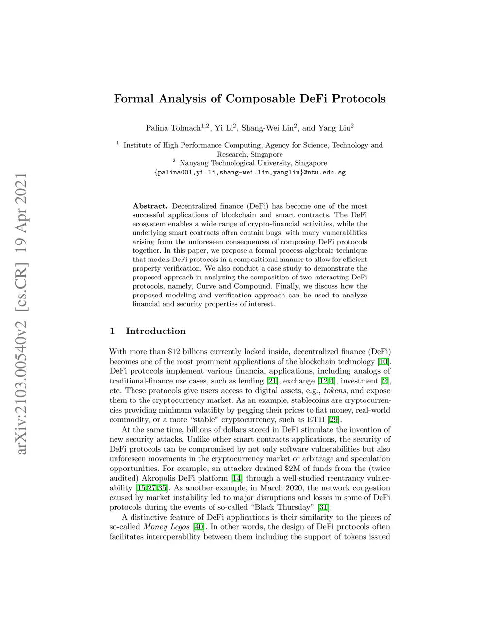 Decentralized finance (DeFi) has become one of the most successful applications of blockchain and smart contracts. The DeFi ecosystem enables a wide range of crypto-financial activities, while the underlying smart contracts often contain bugs, with many vulnerabilities arising from the unforeseen consequences of composing DeFi protocols together. In this paper, we propose a formal process-algebraic technique that models DeFi protocols in a compositional manner to allow for efficient property verification. We also conduct a case study to demonstrate the proposed approach in analyzing the composition of two interacting DeFi protocols, namely, Curve and Compound. Finally, we discuss how the proposed modeling and verification approach can be used to analyze financial and security properties of interest.