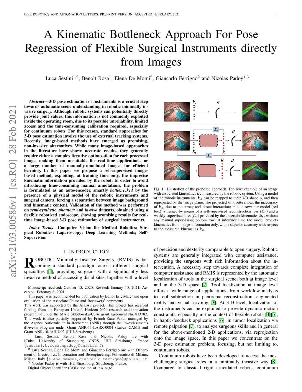 3-D pose estimation of instruments is a crucial step towards automatic scene understanding in robotic minimally invasive surgery. Although robotic systems can potentially directly provide joint values, this information is not commonly exploited inside the operating room, due to its possible unreliability, limited access and the time-consuming calibration required, especially for continuum robots. For this reason, standard approaches for 3-D pose estimation involve the use of external tracking systems. Recently, image-based methods have emerged as promising, non-invasive alternatives. While many image-based approaches in the literature have shown accurate results, they generally require either a complex iterative optimization for each processed image, making them unsuitable for real-time applications, or a large number of manually-annotated images for efficient learning. In this paper we propose a self-supervised image-based method, exploiting, at training time only, the imprecise kinematic information provided by the robot. In order to avoid introducing time-consuming manual annotations, the problem is formulated as an auto-encoder, smartly bottlenecked by the presence of a physical model of the robotic instruments and surgical camera, forcing a separation between image background and kinematic content. Validation of the method was performed on semi-synthetic, phantom and in-vivo datasets, obtained using a flexible robotized endoscope, showing promising results for real-time image-based 3-D pose estimation of surgical instruments.