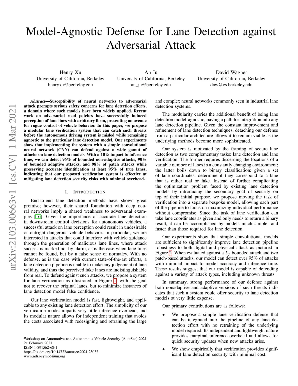 Susceptibility of neural networks to adversarial attack prompts serious safety concerns for lane detection efforts, a domain where such models have been widely applied. Recent work on adversarial road patches have successfully induced perception of lane lines with arbitrary form, presenting an avenue for rogue control of vehicle behavior. In this paper, we propose a modular lane verification system that can catch such threats before the autonomous driving system is misled while remaining agnostic to the particular lane detection model. Our experiments show that implementing the system with a simple convolutional neural network (CNN) can defend against a wide gamut of attacks on lane detection models. With a 10% impact to inference time, we can detect 96% of bounded non-adaptive attacks, 90% of bounded adaptive attacks, and 98% of patch attacks while preserving accurate identification at least 95% of true lanes, indicating that our proposed verification system is effective at mitigating lane detection security risks with minimal overhead.