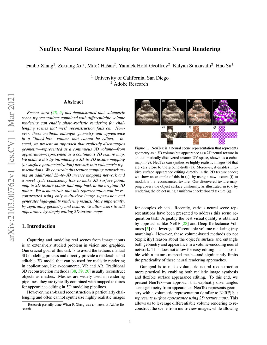Recent work has demonstrated that volumetric scene representations combined with differentiable volume rendering can enable photo-realistic rendering for challenging scenes that mesh reconstruction fails on. However, these methods entangle geometry and appearance in a "black-box" volume that cannot be edited. Instead, we present an approach that explicitly disentangles geometry--represented as a continuous 3D volume--from appearance--represented as a continuous 2D texture map. We achieve this by introducing a 3D-to-2D texture mapping (or surface parameterization) network into volumetric representations. We constrain this texture mapping network using an additional 2D-to-3D inverse mapping network and a novel cycle consistency loss to make 3D surface points map to 2D texture points that map back to the original 3D points. We demonstrate that this representation can be reconstructed using only multi-view image supervision and generates high-quality rendering results. More importantly, by separating geometry and texture, we allow users to edit appearance by simply editing 2D texture maps.
