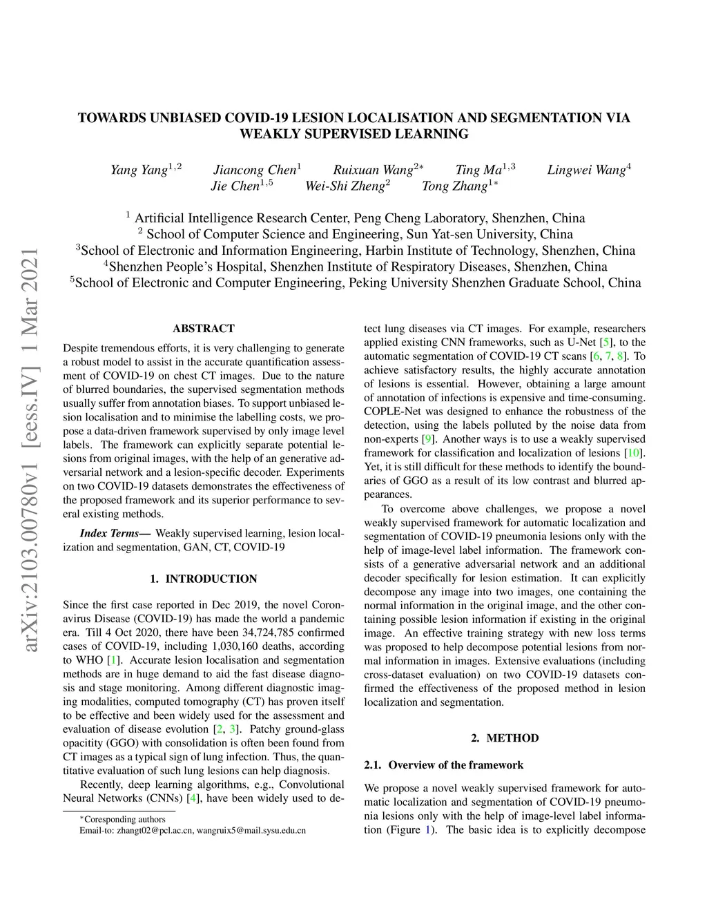 Despite tremendous efforts, it is very challenging to generate a robust model to assist in the accurate quantification assessment of COVID-19 on chest CT images. Due to the nature of blurred boundaries, the supervised segmentation methods usually suffer from annotation biases. To support unbiased lesion localisation and to minimise the labeling costs, we propose a data-driven framework supervised by only image-level labels. The framework can explicitly separate potential lesions from original images, with the help of a generative adversarial network and a lesion-specific decoder. Experiments on two COVID-19 datasets demonstrate the effectiveness of the proposed framework and its superior performance to several existing methods.
