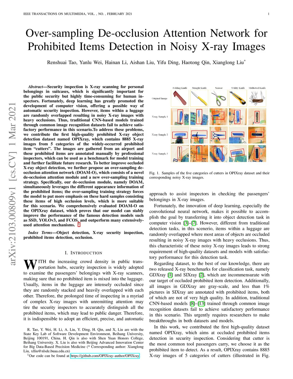 Security inspection is X-ray scanning for personal belongings in suitcases, which is significantly important for the public security but highly time-consuming for human inspectors. Fortunately, deep learning has greatly promoted the development of computer vision, offering a possible way of automatic security inspection. However, items within a luggage are randomly overlapped resulting in noisy X-ray images with heavy occlusions. Thus, traditional CNN-based models trained through common image recognition datasets fail to achieve satisfactory performance in this scenario. To address these problems, we contribute the first high-quality prohibited X-ray object detection dataset named OPIXray, which contains 8885 X-ray images from 5 categories of the widely-occurred prohibited item ``cutters''. The images are gathered from an airport and these prohibited items are annotated manually by professional inspectors, which can be used as a benchmark for model training and further facilitate future research. To better improve occluded X-ray object detection, we further propose an over-sampling de-occlusion attention network (DOAM-O), which consists of a novel de-occlusion attention module and a new over-sampling training strategy. Specifically, our de-occlusion module, namely DOAM, simultaneously leverages the different appearance information of the prohibited items; the over-sampling training strategy forces the model to put more emphasis on these hard samples consisting these items of high occlusion levels, which is more suitable for this scenario. We comprehensively evaluated DOAM-O on the OPIXray dataset, which proves that our model can stably improve the performance of the famous detection models such as SSD, YOLOv3, and FCOS, and outperform many extensively-used attention mechanisms.