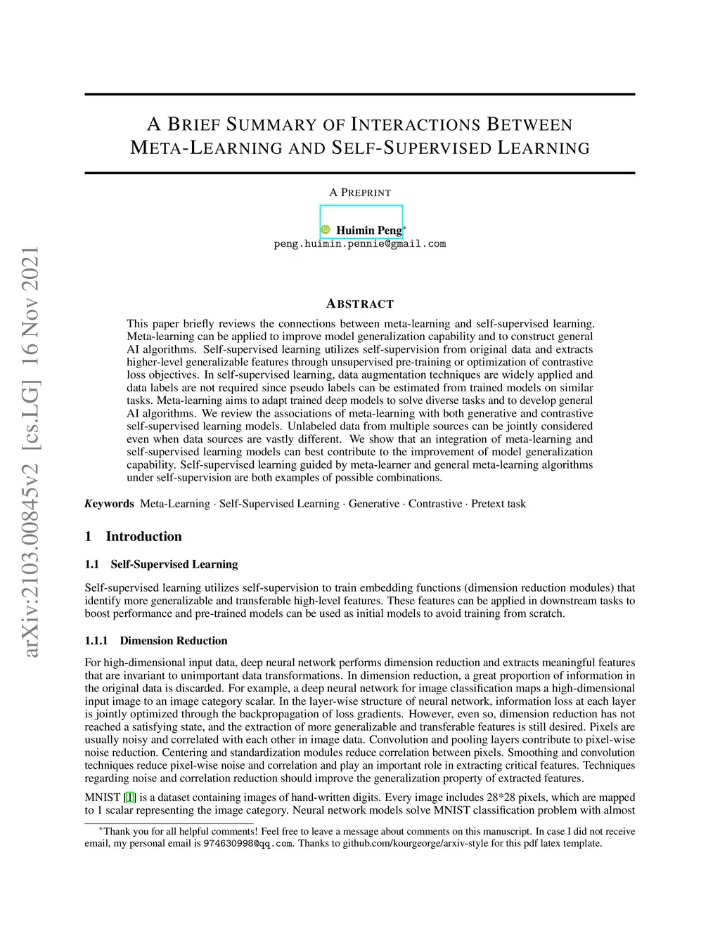 This paper briefly reviews the connections between meta-learning and self-supervised learning. Meta-learning can be applied to improve model generalization capability and to construct general AI algorithms. Self-supervised learning utilizes self-supervision from original data and extracts higher-level generalizable features through unsupervised pre-training or optimization of contrastive loss objectives. In self-supervised learning, data augmentation techniques are widely applied and data labels are not required since pseudo labels can be estimated from trained models on similar tasks. Meta-learning aims to adapt trained deep models to solve diverse tasks and to develop general AI algorithms. We review the associations of meta-learning with both generative and contrastive self-supervised learning models. Unlabeled data from multiple sources can be jointly considered even when data sources are vastly different. We show that an integration of meta-learning and self-supervised learning models can best contribute to the improvement of model generalization capability. Self-supervised learning guided by meta-learner and general meta-learning algorithms under self-supervision are both examples of possible combinations.