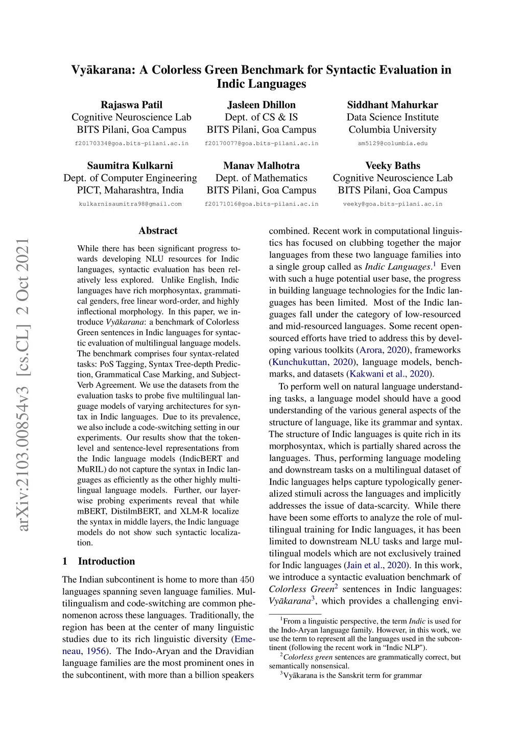 Vyākarana: A Colorless Green Benchmark for Syntactic Evaluation in