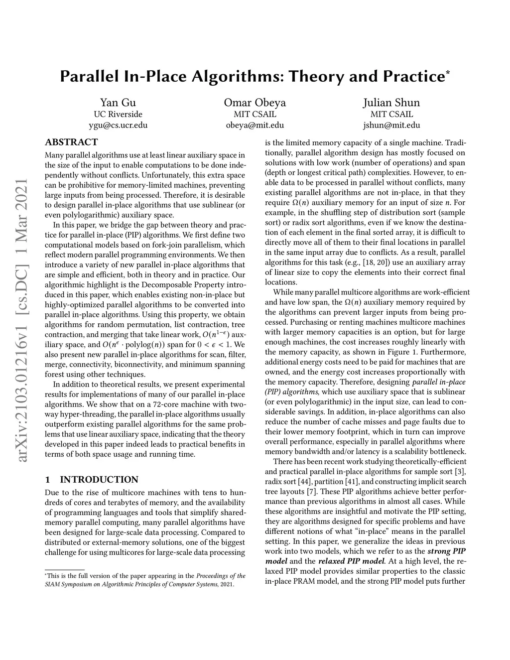 Many parallel algorithms use at least linear auxiliary space in the size of the input to enable computations to be done independently without conflicts. Unfortunately, this extra space can be prohibitive for memory-limited machines, preventing large inputs from being processed. Therefore, it is desirable to design parallel in-place algorithms that use sublinear (or even polylogarithmic) auxiliary space. In this paper, we bridge the gap between theory and practice for parallel in-place (PIP) algorithms. We first define two computational models based on fork-join parallelism, which reflect modern parallel programming environments. We then introduce a variety of new parallel in-place algorithms that are simple and efficient, both in theory and in practice. Our algorithmic highlight is the Decomposable Property introduced in this paper, which enables existing non-in-place but highly-optimized parallel algorithms to be converted into parallel in-place algorithms. Using this property, we obtain algorithms for random permutation, list contraction, tree contraction, and merging that take linear work, auxiliary space, and span for . We also present new parallel in-place algorithms for scan, filter, merge, connectivity, biconnectivity, and minimum spanning forest using other techniques. In addition to theoretical results, we present experimental results for implementations of many of our parallel in-place algorithms. We show that on a 72-core machine with two-way hyper-threading, the parallel in-place algorithms usually outperform existing parallel algorithms for the same problems that use linear auxiliary space, indicating that the theory developed in this paper indeed leads to practical benefits in terms of both space usage and running time.