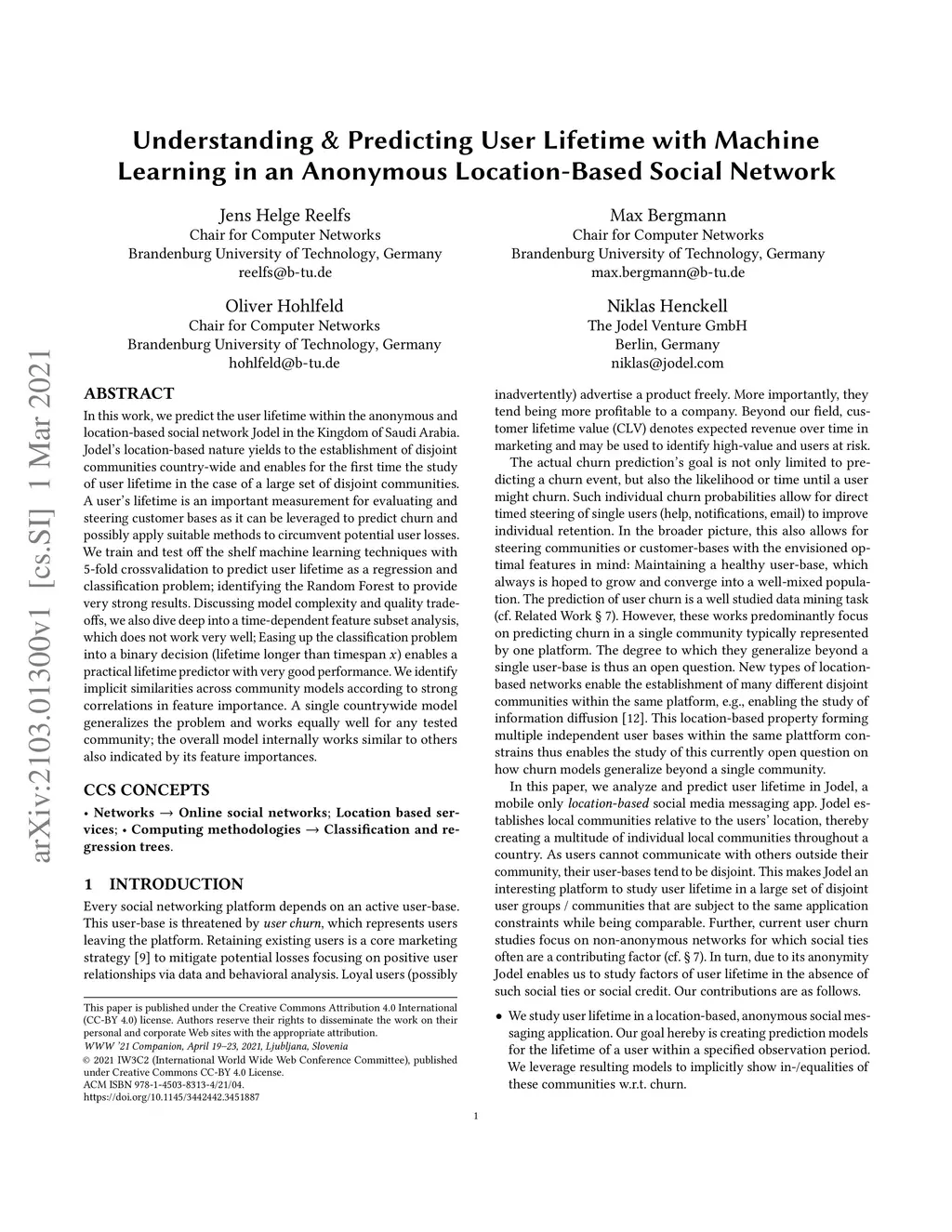 In this work, we predict the user lifetime within the anonymous and location-based social network Jodel in the Kingdom of Saudi Arabia. Jodel's location-based nature yields to the establishment of disjoint communities country-wide and enables for the first time the study of user lifetime in the case of a large set of disjoint communities. A user's lifetime is an important measurement for evaluating and steering customer bases as it can be leveraged to predict churn and possibly apply suitable methods to circumvent potential user losses. We train and test off the shelf machine learning techniques with 5-fold crossvalidation to predict user lifetime as a regression and classification problem; identifying the Random Forest to provide very strong results. Discussing model complexity and quality trade-offs, we also dive deep into a time-dependent feature subset analysis, which does not work very well; Easing up the classification problem into a binary decision (lifetime longer than timespan ) enables a practical lifetime predictor with very good performance. We identify implicit similarities across community models according to strong correlations in feature importance. A single countrywide model generalizes the problem and works equally well for any tested community; the overall model internally works similar to others also indicated by its feature importances.