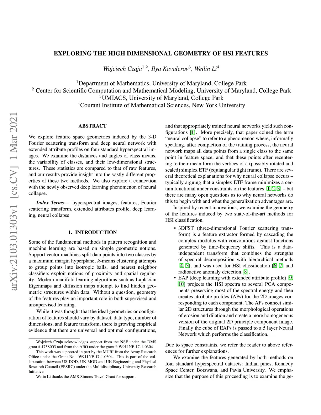 We explore feature space geometries induced by the 3-D Fourier scattering transform and deep neural network with extended attribute profiles on four standard hyperspectral images. We examine the distances and angles of class means, the variability of classes, and their low-dimensional structures. These statistics are compared to that of raw features, and our results provide insight into the vastly different properties of these two methods. We also explore a connection with the newly observed deep learning phenomenon of neural collapse.