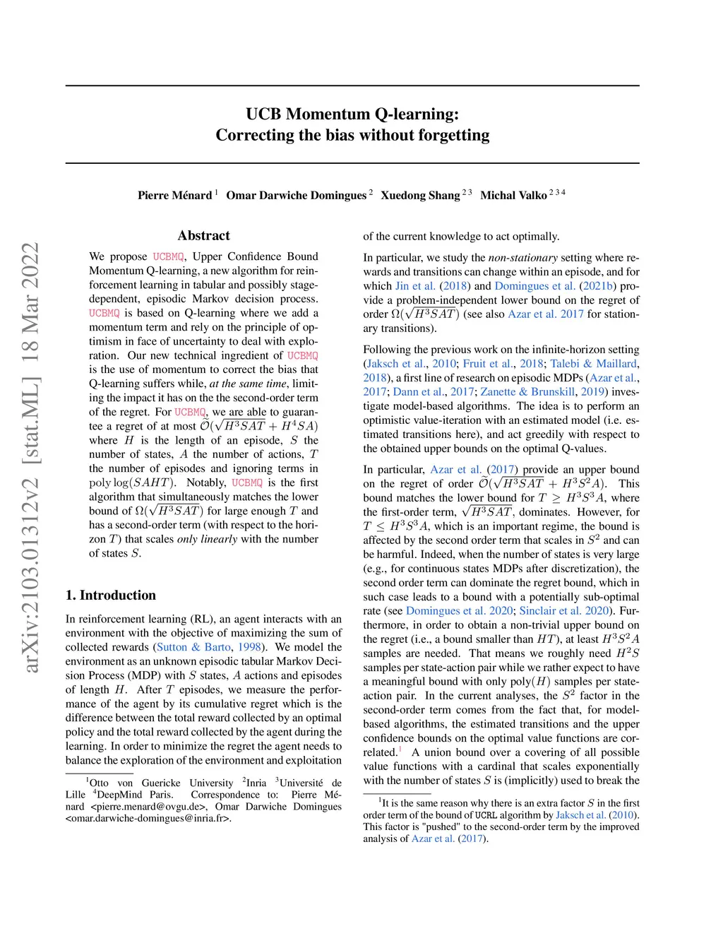 UCB Momentum Q-learning: Correcting the bias without forgetting