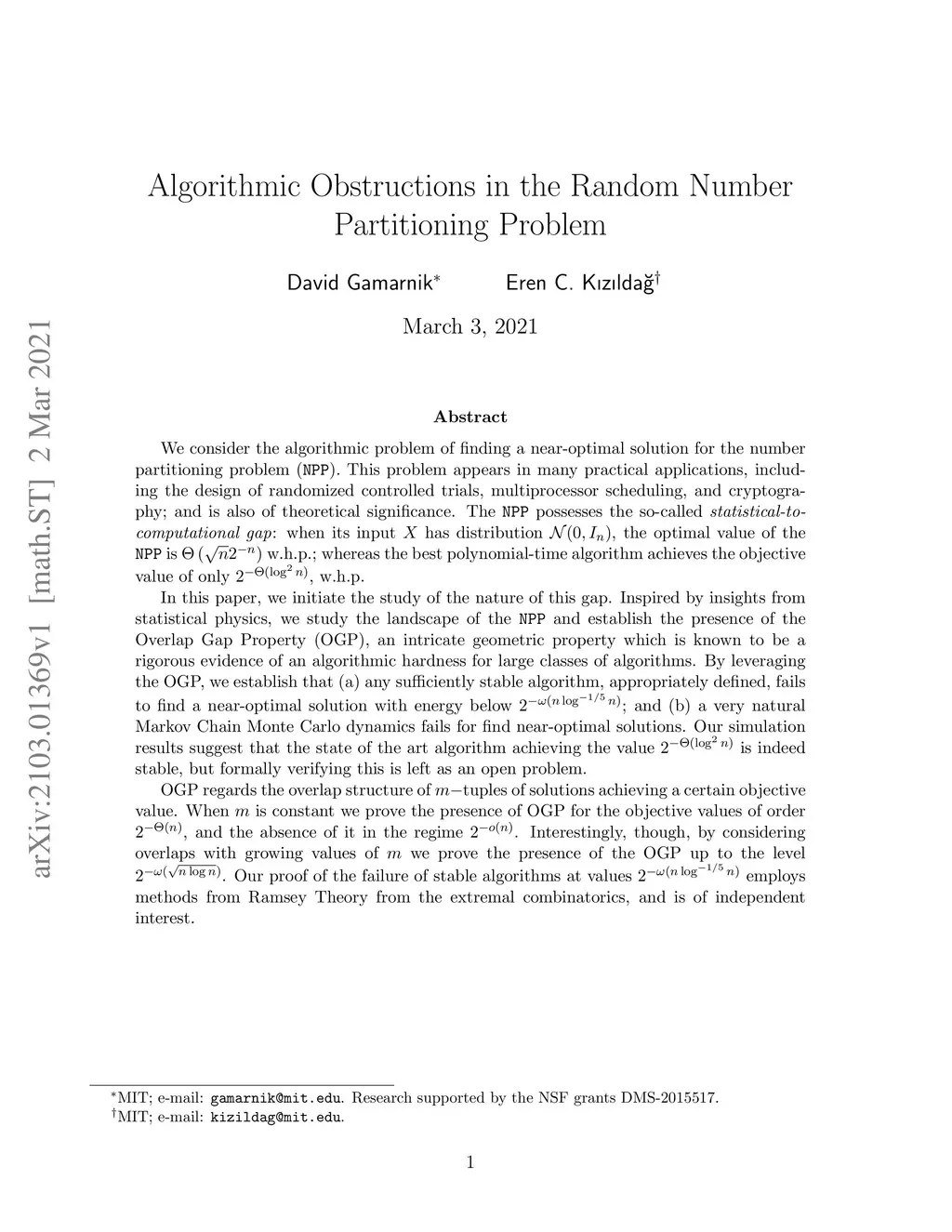 We consider the algorithmic problem of finding a near-optimal solution for the number partitioning problem (NPP). The NPP appears in many applications, including the design of randomized controlled trials, multiprocessor scheduling, and cryptography; and is also of theoretical significance. It possesses a so-called statistical-to-computational gap: when its input has distribution , its optimal value is w.h.p.; whereas the best polynomial-time algorithm achieves an objective value of only , w.h.p. In this paper, we initiate the study of the nature of this gap. Inspired by insights from statistical physics, we study the landscape of NPP and establish the presence of the Overlap Gap Property (OGP), an intricate geometric property which is known to be a rigorous evidence of an algorithmic hardness for large classes of algorithms. By leveraging the OGP, we establish that (a) any sufficiently stable algorithm, appropriately defined, fails to find a near-optimal solution with energy below ; and (b) a very natural MCMC dynamics fails to find near-optimal solutions. Our simulations suggest that the state of the art algorithm achieving is indeed stable, but formally verifying this is left as an open problem. OGP regards the overlap structure of tuples of solutions achieving a certain objective value. When is constant we prove the presence of OGP in the regime , and the absence of it in the regime . Interestingly, though, by considering overlaps with growing values of we prove the presence of the OGP up to the level . Our proof of the failure of stable algorithms at values employs methods from Ramsey Theory from the extremal combinatorics, and is of independent interest.