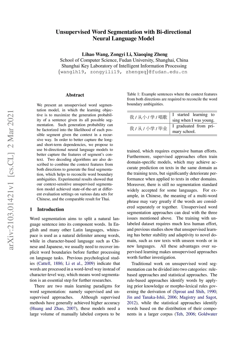 Unsupervised Word Segmentation with Bi-directional Neural Language Model