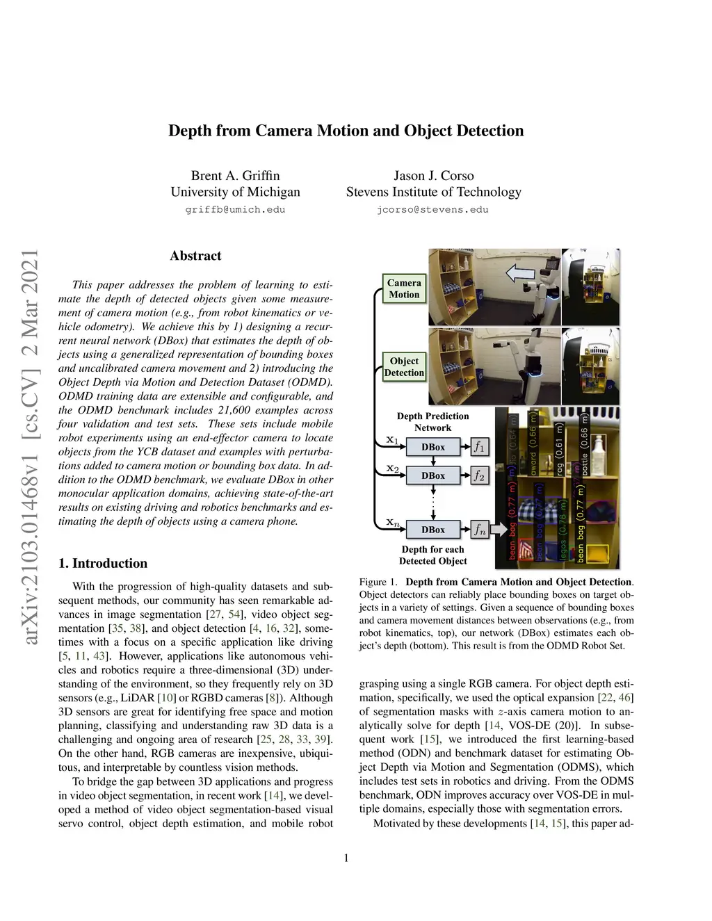 This paper addresses the problem of learning to estimate the depth of detected objects given some measurement of camera motion (e.g., from robot kinematics or vehicle odometry). We achieve this by 1) designing a recurrent neural network (DBox) that estimates the depth of objects using a generalized representation of bounding boxes and uncalibrated camera movement and 2) introducing the Object Depth via Motion and Detection Dataset (ODMD). ODMD training data are extensible and configurable, and the ODMD benchmark includes 21,600 examples across four validation and test sets. These sets include mobile robot experiments using an end-effector camera to locate objects from the YCB dataset and examples with perturbations added to camera motion or bounding box data. In addition to the ODMD benchmark, we evaluate DBox in other monocular application domains, achieving state-of-the-art results on existing driving and robotics benchmarks and estimating the depth of objects using a camera phone.