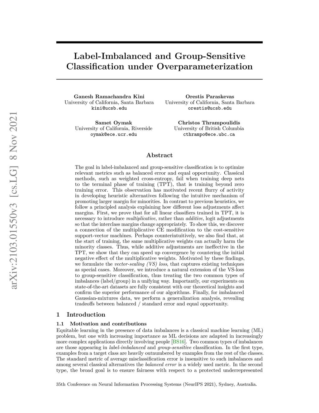 The goal in label-imbalanced and group-sensitive classification is to optimize relevant metrics such as balanced error and equal opportunity. Classical methods, such as weighted cross-entropy, fail when training deep nets to the terminal phase of training (TPT), that is training beyond zero training error. This observation has motivated recent flurry of activity in developing heuristic alternatives following the intuitive mechanism of promoting larger margin for minorities. In contrast to previous heuristics, we follow a principled analysis explaining how different loss adjustments affect margins. First, we prove that for all linear classifiers trained in TPT, it is necessary to introduce multiplicative, rather than additive, logit adjustments so that the interclass margins change appropriately. To show this, we discover a connection of the multiplicative CE modification to the cost-sensitive support-vector machines. Perhaps counterintuitively, we also find that, at the start of training, the same multiplicative weights can actually harm the minority classes. Thus, while additive adjustments are ineffective in the TPT, we show that they can speed up convergence by countering the initial negative effect of the multiplicative weights. Motivated by these findings, we formulate the vector-scaling (VS) loss, that captures existing techniques as special cases. Moreover, we introduce a natural extension of the VS-loss to group-sensitive classification, thus treating the two common types of imbalances (label/group) in a unifying way. Importantly, our experiments on state-of-the-art datasets are fully consistent with our theoretical insights and confirm the superior performance of our algorithms. Finally, for imbalanced Gaussian-mixtures data, we perform a generalization analysis, revealing tradeoffs between balanced / standard error and equal opportunity.