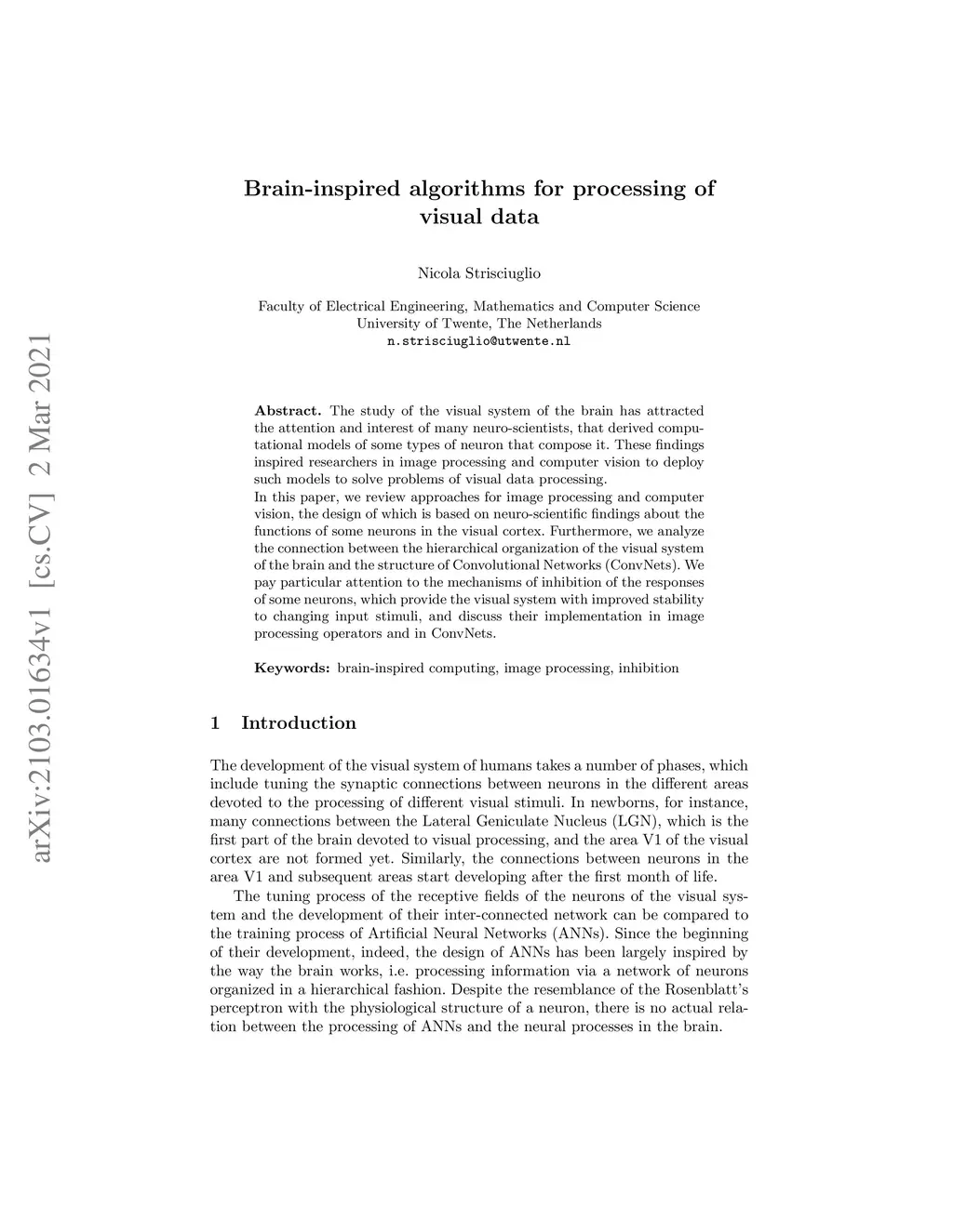 The study of the visual system of the brain has attracted the attention and interest of many neuro-scientists, that derived computational models of some types of neuron that compose it. These findings inspired researchers in image processing and computer vision to deploy such models to solve problems of visual data processing. In this paper, we review approaches for image processing and computer vision, the design of which is based on neuro-scientific findings about the functions of some neurons in the visual cortex. Furthermore, we analyze the connection between the hierarchical organization of the visual system of the brain and the structure of Convolutional Networks (ConvNets). We pay particular attention to the mechanisms of inhibition of the responses of some neurons, which provide the visual system with improved stability to changing input stimuli, and discuss their implementation in image processing operators and in ConvNets.