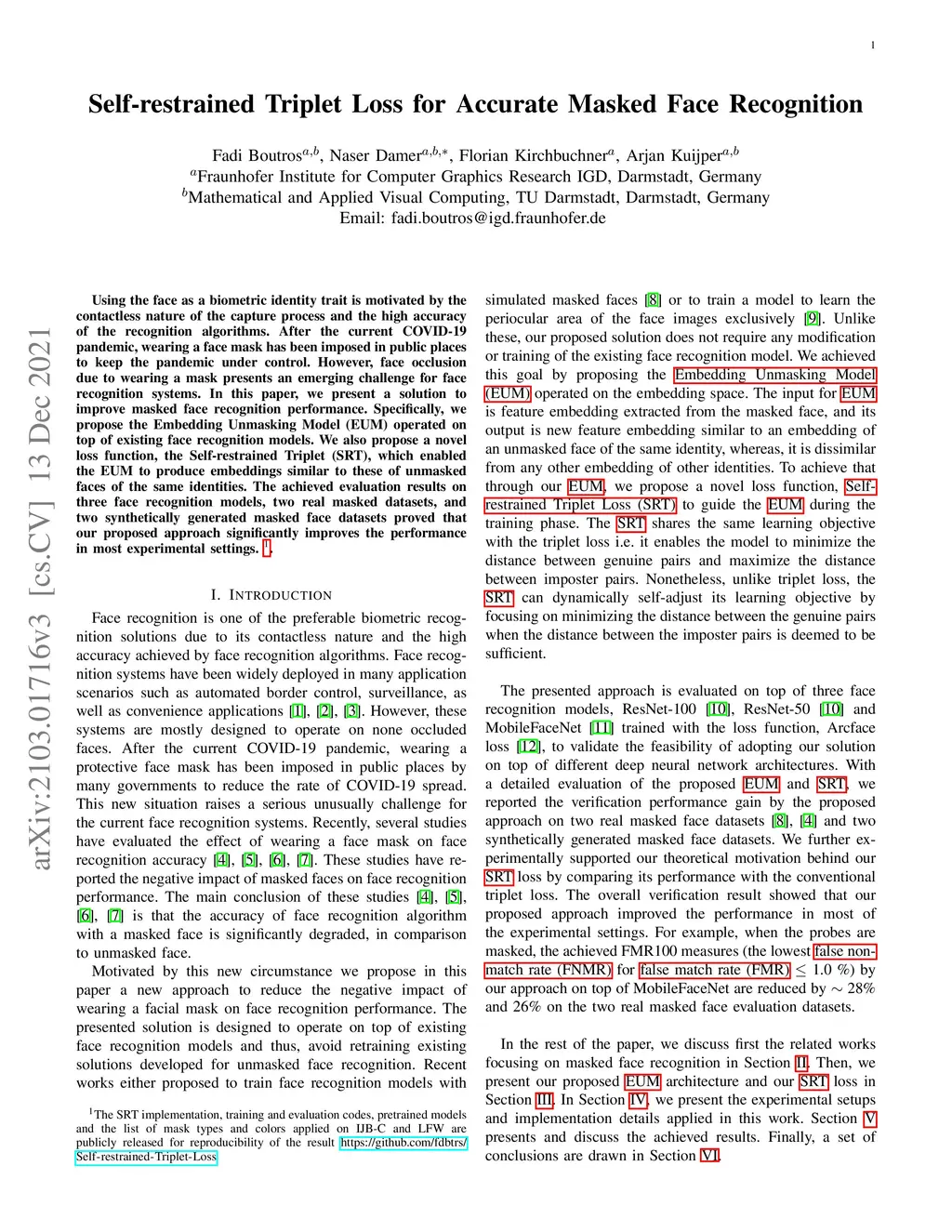 Using the face as a biometric identity trait is motivated by the contactless nature of the capture process and the high accuracy of the recognition algorithms. After the current COVID-19 pandemic, wearing a face mask has been imposed in public places to keep the pandemic under control. However, face occlusion due to wearing a mask presents an emerging challenge for face recognition systems. In this paper, we present a solution to improve masked face recognition performance. Specifically, we propose the Embedding Unmasking Model (EUM) operated on top of existing face recognition models. We also propose a novel loss function, the Self-restrained Triplet (SRT), which enabled the EUM to produce embeddings similar to these of unmasked faces of the same identities. The achieved evaluation results on three face recognition models, two real masked datasets, and two synthetically generated masked face datasets proved that our proposed approach significantly improves the performance in most experimental settings.