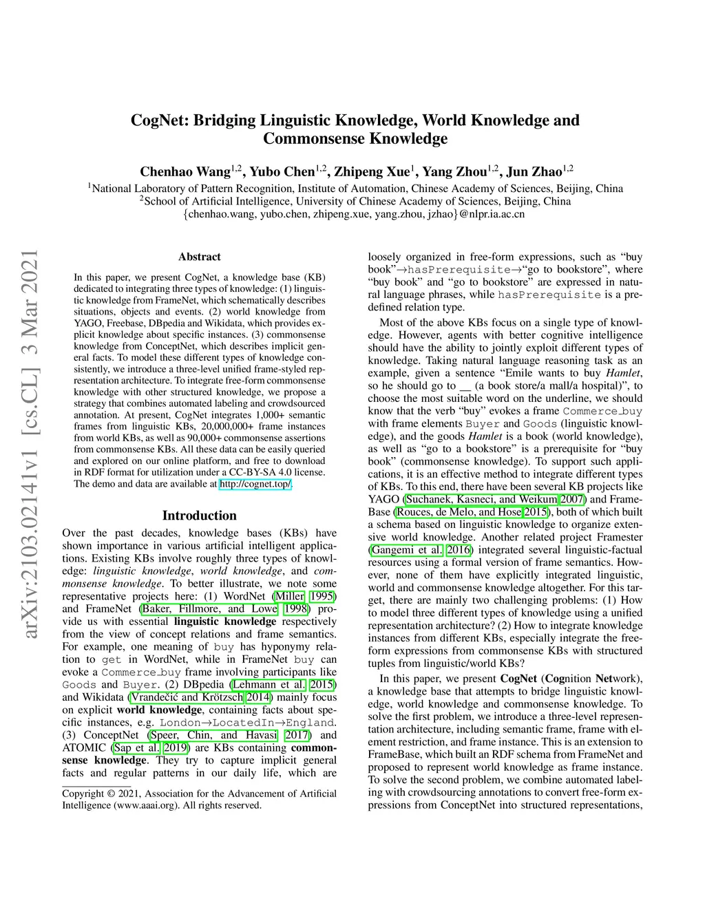 CogNet: Bridging Linguistic Knowledge, World Knowledge and Commonsense