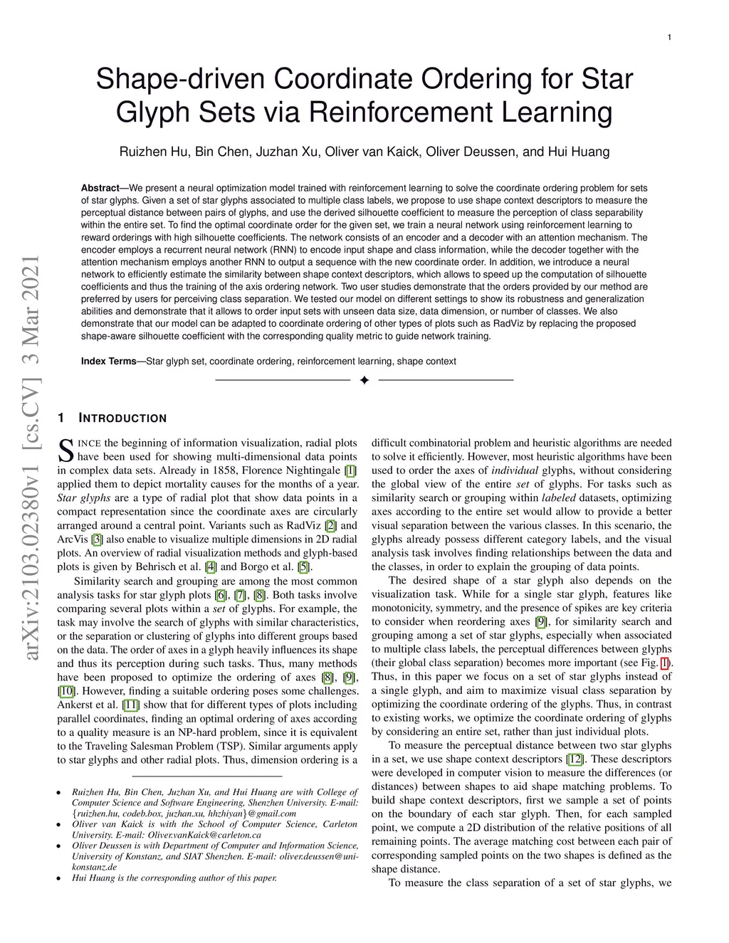 We present a neural optimization model trained with reinforcement learning to solve the coordinate ordering problem for sets of star glyphs. Given a set of star glyphs associated to multiple class labels, we propose to use shape context descriptors to measure the perceptual distance between pairs of glyphs, and use the derived silhouette coefficient to measure the perception of class separability within the entire set. To find the optimal coordinate order for the given set, we train a neural network using reinforcement learning to reward orderings with high silhouette coefficients. The network consists of an encoder and a decoder with an attention mechanism. The encoder employs a recurrent neural network (RNN) to encode input shape and class information, while the decoder together with the attention mechanism employs another RNN to output a sequence with the new coordinate order. In addition, we introduce a neural network to efficiently estimate the similarity between shape context descriptors, which allows to speed up the computation of silhouette coefficients and thus the training of the axis ordering network. Two user studies demonstrate that the orders provided by our method are preferred by users for perceiving class separation. We tested our model on different settings to show its robustness and generalization abilities and demonstrate that it allows to order input sets with unseen data size, data dimension, or number of classes. We also demonstrate that our model can be adapted to coordinate ordering of other types of plots such as RadViz by replacing the proposed shape-aware silhouette coefficient with the corresponding quality metric to guide network training.