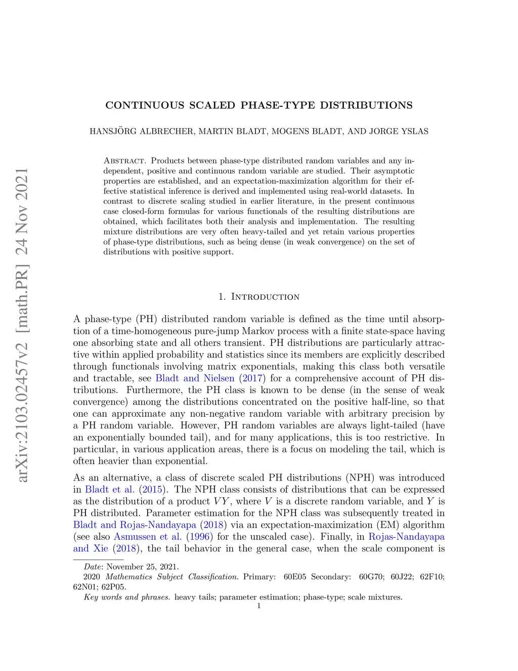 Products between phase-type distributed random variables and any independent, positive and continuous random variable are studied. Their asymptotic properties are established, and an expectation-maximization algorithm for their effective statistical inference is derived and implemented using real-world datasets. In contrast to discrete scaling studied in earlier literature, in the present continuous case closed-form formulas for various functionals of the resulting distributions are obtained, which facilitates both their analysis and implementation. The resulting mixture distributions are very often heavy-tailed and yet retain various properties of phase-type distributions, such as being dense (in weak convergence) on the set of distributions with positive support.