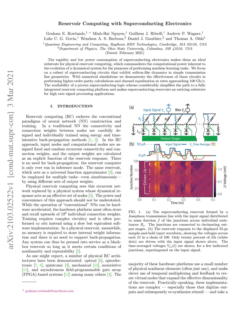 The rapidity and low power consumption of superconducting electronics makes them an ideal substrate for physical reservoir computing, which commandeers the computational power inherent to the evolution of a dynamical system for the purposes of performing machine learning tasks. We focus on a subset of superconducting circuits that exhibit soliton-like dynamics in simple transmission line geometries. With numerical simulations we demonstrate the effectiveness of these circuits in performing higher-order parity calculations and channel equalization at rates approaching 100 Gb/s. The availability of a proven superconducting logic scheme considerably simplifies the path to a fully integrated reservoir computing platform and makes superconducting reservoirs an enticing substrate for high rate signal processing applications.