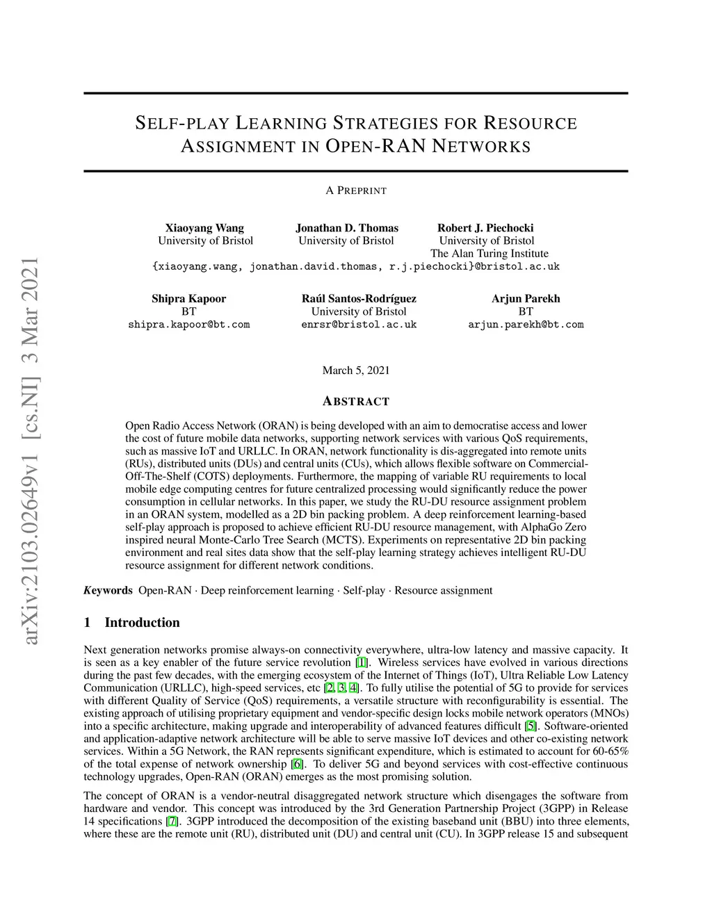 Self-play Learning Strategies for Resource Assignment in Open-RAN