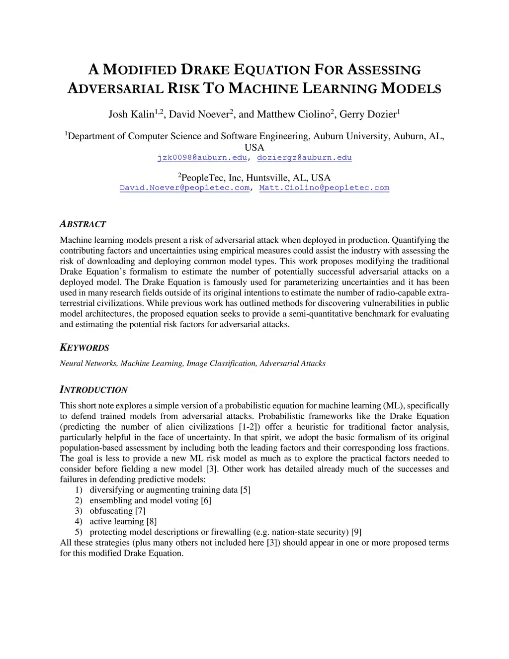 Machine learning models present a risk of adversarial attack when deployed in production. Quantifying the contributing factors and uncertainties using empirical measures could assist the industry with assessing the risk of downloading and deploying common model types. This work proposes modifying the traditional Drake Equation's formalism to estimate the number of potentially successful adversarial attacks on a deployed model. The Drake Equation is famously used for parameterizing uncertainties and it has been used in many research fields outside of its original intentions to estimate the number of radio-capable extra-terrestrial civilizations. While previous work has outlined methods for discovering vulnerabilities in public model architectures, the proposed equation seeks to provide a semi-quantitative benchmark for evaluating and estimating the potential risk factors for adversarial attacks.