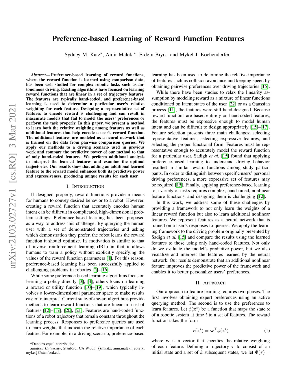 Preference-based learning of reward functions, where the reward function is learned using comparison data, has been well studied for complex robotic tasks such as autonomous driving. Existing algorithms have focused on learning reward functions that are linear in a set of trajectory features. The features are typically hand-coded, and preference-based learning is used to determine a particular user's relative weighting for each feature. Designing a representative set of features to encode reward is challenging and can result in inaccurate models that fail to model the users' preferences or perform the task properly. In this paper, we present a method to learn both the relative weighting among features as well as additional features that help encode a user's reward function. The additional features are modeled as a neural network that is trained on the data from pairwise comparison queries. We apply our methods to a driving scenario used in previous work and compare the predictive power of our method to that of only hand-coded features. We perform additional analysis to interpret the learned features and examine the optimal trajectories. Our results show that adding an additional learned feature to the reward model enhances both its predictive power and expressiveness, producing unique results for each user.